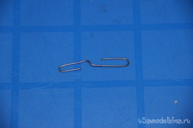 Шаг 5: Берём палочку длинной 50 мм. С одной стороны приклеиваем скрепку. Затем вставляем палочку в отверстие каркаса машинки, и продеваем деталь которую мы делали ранее, и приклеиваем крышку.