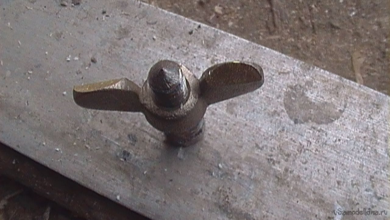 И так начнём! От карниза отрезаем «турбинкой» «направляющие» нужной длинны. В доске делаем 2 пропила на циркуляре, один для двигателя, другой для упорной рейки по ширине направляющей. Края направляющих подрезаем под угол пропила дисковой пилой и вставляем в пропилы снизу. Направляющие должны входить в пропилы с натягом. Лишнюю толщину доски убираем с помощью вставок Их подкладываем под направляющие и примеряем на месте. Для того, что бы болты не проворачивались в направляющих, от крепления метапола Отрезаем нижнюю часть на нужную толщину. Делаем пропилы и среднюю часть убираем стамеской. Центральное отверстие рассверливаем до 6 мм. Получается такая деталь. В неё вставляем болт Готовый продукт устанавливаем в направляющую. После направляющую вставляем в пропил доски. Устанавливаем вставки Кладём на вторую доску такого же размера. Сверлим отверстия в углах досок под саморезы и, вкручивая стягиваем доски между собой. Выступающую часть саморезов убираем с помощью турбинки. Далее на один конец крепим основание электродвигателя соосно направляющей. На другую сторону устанавливаем заднюю бабку. Установив электродвигатель на основание, совмещаем ценра и закрепляем двигатель. На вторую направляющую устанавливаем упорную планку. У меня она сделана из оргстекла толщиной 10 мм. Прорези в креплениях для рейки сначала сверлил сверлом 6,5 и пропиливал ножовкой по металлу. Соединены они с рейкой с помощью уголков. Отдельно расскажу, как был сделан центр к двигателю. На болт М6 накрутил 2 гайки, затянул ключом и зажав в патрон электродрели проточил наждаком до нужного размера. Барашковую гайку заточил с одной стороны. Заточка с тыльной стороны. Для более крупных заготовок можно использовать болт толще. Станок готов. Установив заготовку в станок можно приступать к обработке.