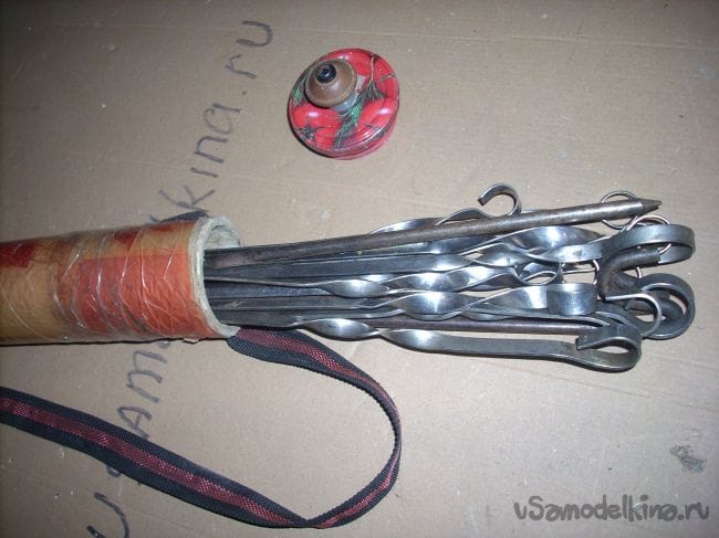 Да, совсем забыл... Ещё я вырезал кружок из толстой резины и затолкал его на дно тубуса, чтобы шампура не пробивали дно.