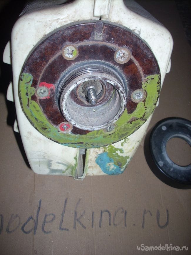 Отвернул накидную гайку и отсоединил двигатель. Парни, вместо того, чтобы заменить манжету, пытались убрать течь, промазав место соединения двигателя с баком масляной краской! :wink: Причём, только по нижней части! (Видимо решив, что раз вода снизу течёт, то и мазать надо там! :belay: Умные парни! Понятно, почему выбросили, не разобрав!) Оказалось, что крыльчатка-активатор накручивалась на вал двигателя посредством резьбы М8 :