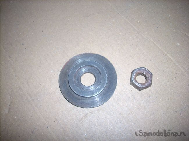 С одной стороны - внутренняя резьба М8, посредством которой она будет крепиться к валу мотора. На неё оденется наждачный круг и зажмётся гайкой М10, с вот такой вот хитрой шайбой: