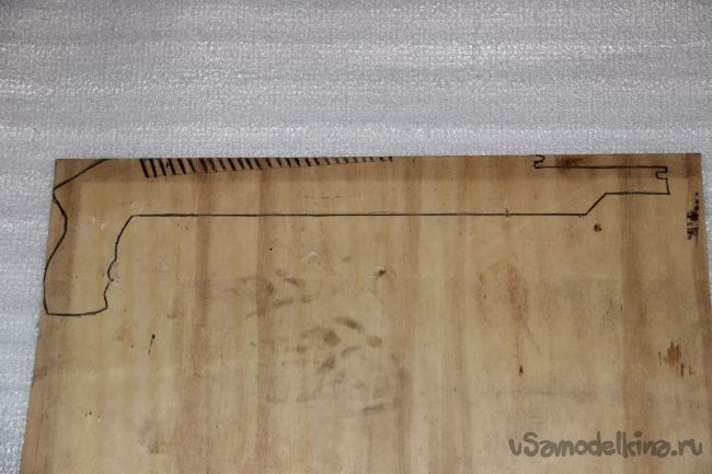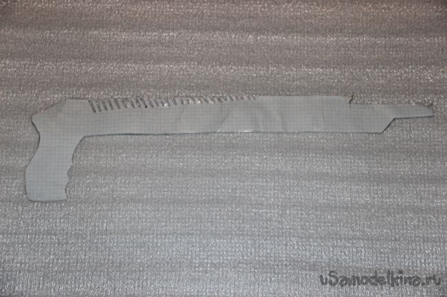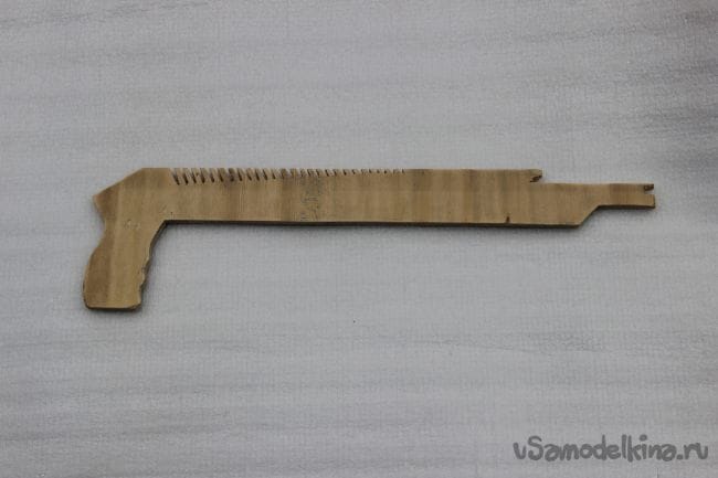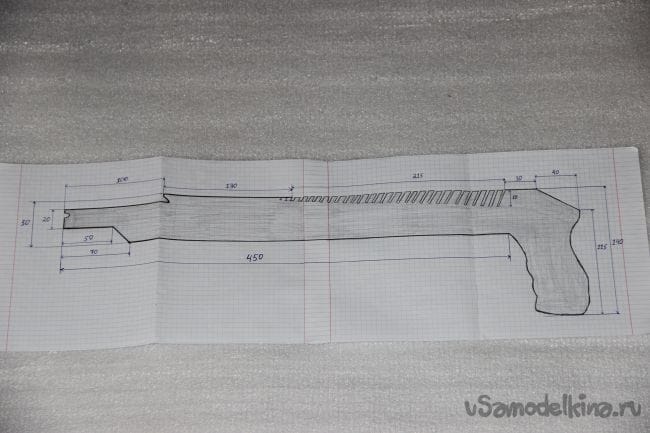 Шаг 1: Для начала я сделал чертёж "дробовика" в натуральных размерах и вырезал его, чтобы было проще перевести его на фанеру. После того как перевели чертёж начинаем вырезать нашу основу. Заготовку нужно хорошо обработать наждачной бумагой, чтобы при стрельбе не получить заноз.