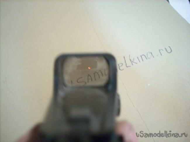 Прицел коллиматорного типа - это так называемый, «быстрый прицел». Для прицеливания достаточно повернуть оружие так, чтобы красная точка на стекле попадала на цель. Такой прицел совмещает в себе достоинства как открытого, так и оптического прицела, потому что он позволяет при наведении оружия на цель, пользоваться двумя глазами, что существенно увеличивает сектор обзора. В то же время его можно совместить с увеличительной линзой... Но всё это касается дорогих прицелов, предназначенных для серьёзного оружия. Эта же модель - простейшая! Оптического увеличения в ней нет. Светодиод проецирует красную точку на экран из слегка тонированного стекла. (Благодаря напылению, точку хорошо видно даже при ярком солнце).
