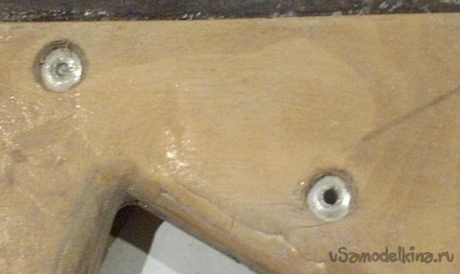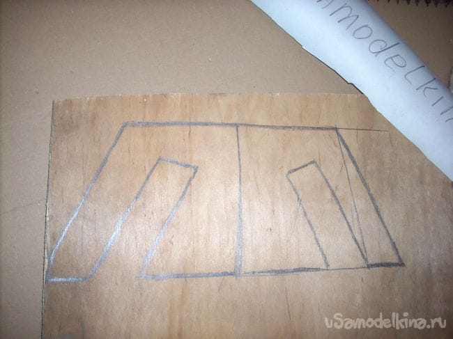 Далее, отрезаем "болгаркой" всё лишнее, и по получившемуся шаблону рисуем на куске фанеры две ручки. Я использовал обрезки фанеры, оставшиеся от других самоделок: Получившиеся накладки я закрепил при помощи заклёпок: