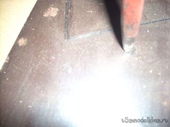 Чтобы не ошибиться, ненужные мне части пилы заштриховал. Далее, я приступил к пробивке отверстий. Именно пробивке. Дело в том, что сталь, используемая в пилах - высокоуглеродистая и обладает большой твёрдостью, поэтому, просверлить отверстие не удастся. Но пробить можно - сталь достаточно хрупкая. Чтобы исключить растрескивание, отверстия я решил пробить до того, как вырежу заготовку - так они будут далеко от края пилы.