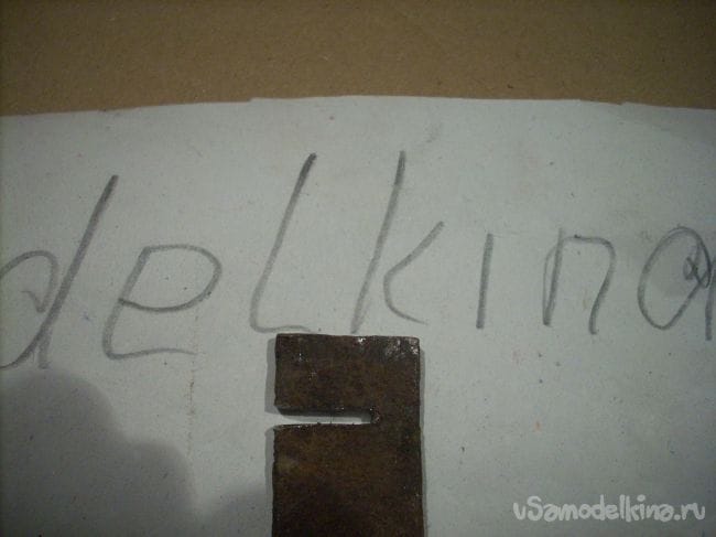 Теперь приступим к разводке. Для этого я изготовил специальный инструмент. Делается он очень просто - отрезаем кусок металлической полосы (у меня - остатки шины заземления) и у одного края прорезаем отрезным кругом прорезь: