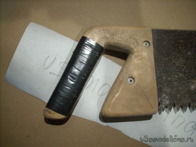 Так пробиваем все нужные нам отверстия. Три - для крепления рукоятки, и одно - на конце нашей ножовки: оно нужно, чтобы потом повесить её на гвоздь: