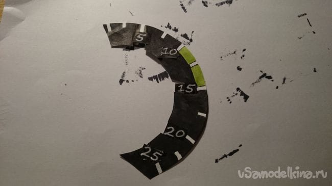Дальше вырезал из бумаги "радугу", перенес на нее все пометки и начал прорезать "окошки" и наклеивать распечатанные цифры, покрасил все вокруг черным маркером, чтобы не просвечивал, примерил со стрелкой.