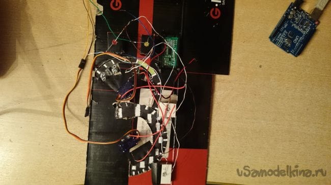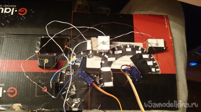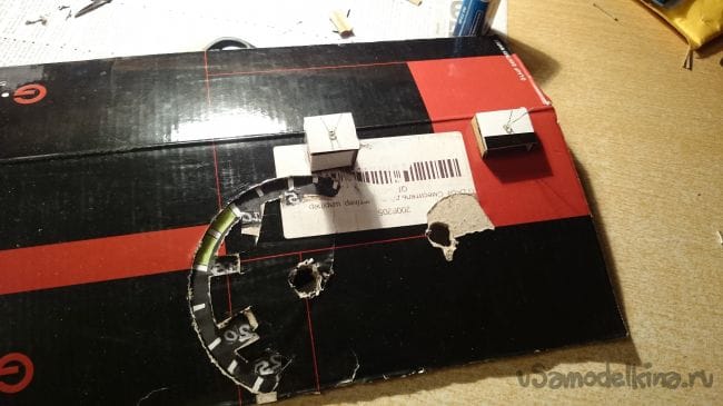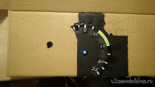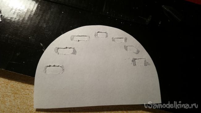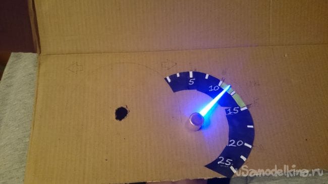 Для того чтобы ее потом можно было одеть на ось сервомотора, я вырезал из плотного картона лепешку, проделал в ней да отверстия под проволоку-выводы для подсветки стрелок, и по центру отверстие для крепления на ось мотора: