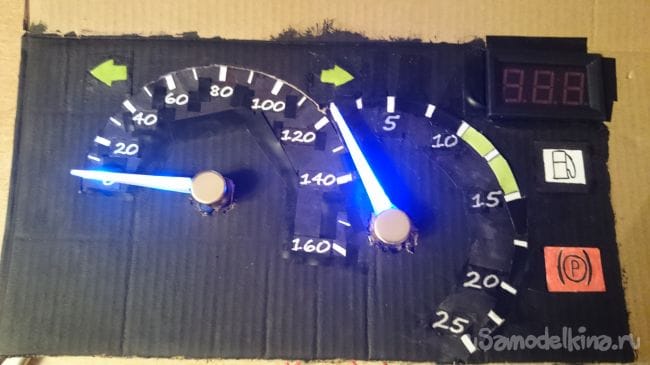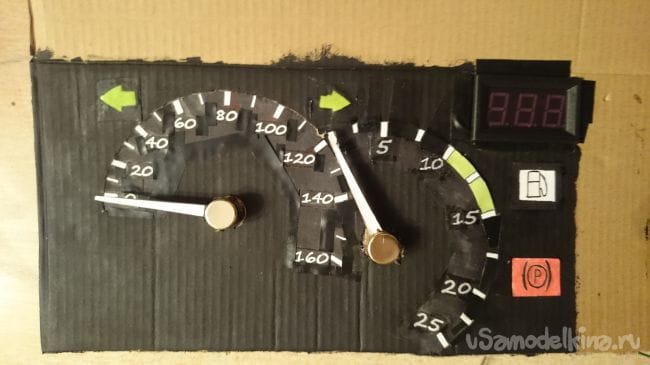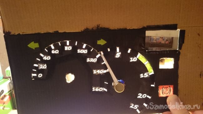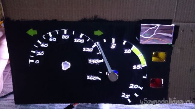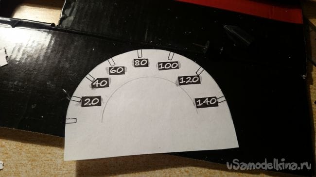 Далее спидометр, делал так же как и тахометр: окошки, приклеивал цифры, далее вырезал в основании полоску чтобы шкала просвечивалась, наклеил покрасил. Приклеил сервы, проволоку на подсветку стрел пропустил в отверстия проделанные рядом с отверстием под серво: