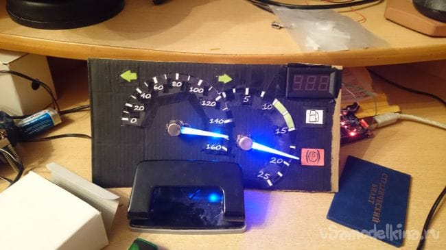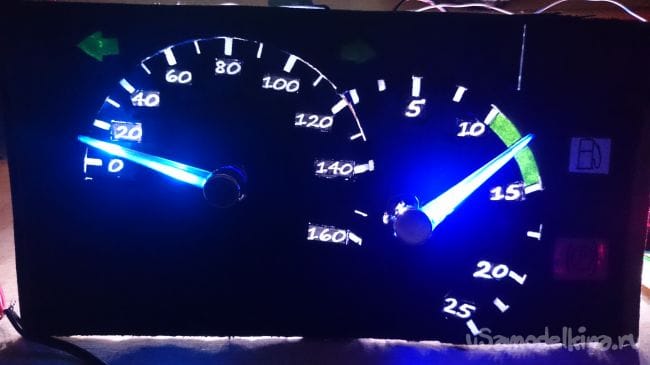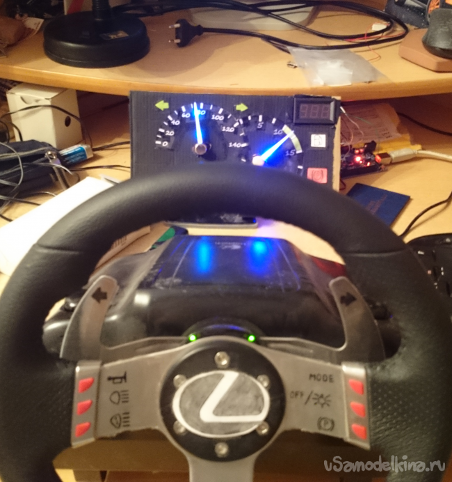 Дальше я подключил сервомоторы, одел стрелки, поставил метку "ноль" на тахометре и спидометре, запустил игру, отрисовал точки на тахометре 10, 15, 20, 25. Так же со спидометром. Порожняком топил по трассе, помечая точки в 20, 40, 60, 80, 100, 120, 140, 160.