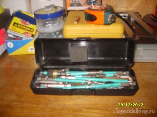 Какие только баночки и коробочки можно встретить  в мастерской у Мастера для хранения мелких предметов. У меня в «ходу» пеналы от   съемных панелей,  автомобильных радиоприемников. Думаю многие этим воспользовались.