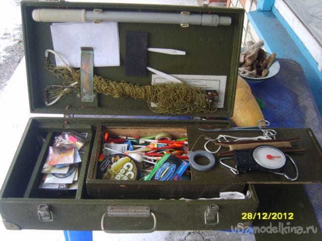 Вот так я храню свои рыболовецкие аксессуары. Называю его «Тревожный чемоданчик», как в армии. Подходящий ящик-чемодан и есть военный, от прибора. В нем есть все и всегда с собой. Не требуется каждый раз собирать и разбирать, снова.