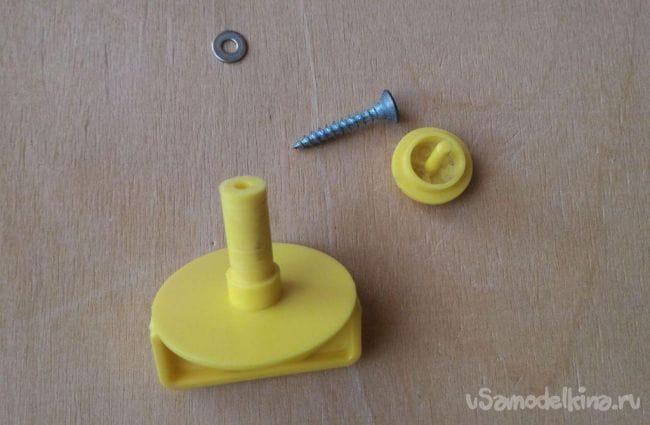 Затем понадобятся: держатель колеса, шуруп и шайба.