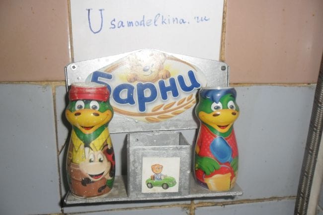 Из жести выгибается полочка или сколачивается из досок (размер произвольный). Пластмассовая баночка играет роль контейнера для хранения зубной пасты. Полочку можно покрасить краской. Я же наклеил на полочке картонную картинку от коробки с медвежонком Барни. Пустые бутылочки шурупами привернем по краям полочки, а пластмассовую баночку укрепим между баночками. У сына полочку к стене привернул шурупами, Загружаем все емкости зубными щетками и тубами с зубной пастой.