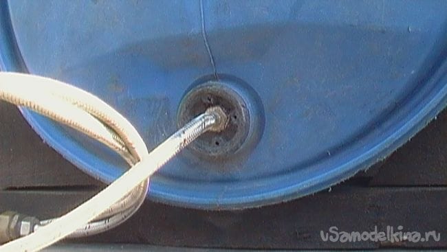 Для этого мне потребовалось: бочка 200 – 250 литров с 2я пробками; деревянный брусок 5 х10 см.; брусок 10 х 10, проволока 6 мм.; плашка М6, 2 гайки М6; ножовка; пружина от эспандера; 2 шурупа; подводка; сверло; электродрель; разводной гаечный ключ; силиконовый герметик.