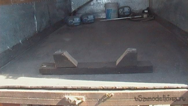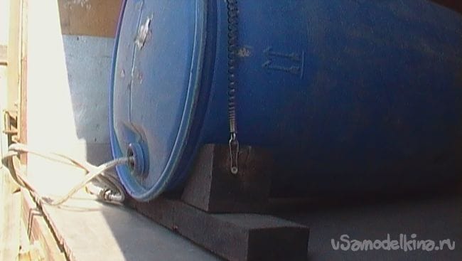 От бруска отпилил 2 куска в виде прямоугольной трапеции. Просверлил в них вертикальное отверстие 6 мм.(можно 2). Кусок проволоки разрезал на 2 равные части. На одном конце сделал загиб, на угол 90 градусов, на другом нарезал резьбу. Установил трапецию, длинной стороной на брусок, просверлил отверстие в бруске 6 мм. Соединил брусок с трапецией с помощью загнутой проволоки и закрутил гайку. Под гайку лучше подложить увеличенную шайбу, для лучшего прижима. Положил бочку на брусок, прижимая к трапеции установил вторую трапецию и сделал разметку. Убрал бочку и просверлил второе отверстие. Так же закрепил вторую трапецию. В торцы трапеций закрутил по шурупу. Положил бочку и натянул пружину. В нижней пробке просверлил отверстие и расширил его до нужной величины. Нарезал дюймовую резьбу и вкрутил, обмазанную герметиком, гайку подводки. Через верхнюю пробку заливаю воду из колонки и везу на дачу. Из за того, что мой участок имеет уклон, я самотёком набираю не только ёмкости под воду для дома и полива, но и заполняю летний душ по летнему «водопроводу», изготовленного из металлопластиковой трубы(б.у.) Так же в летнем водопроводе есть отвод для домашних нужд. Вот такой «водовозкой» пользуюсь. Хорошего урожая!