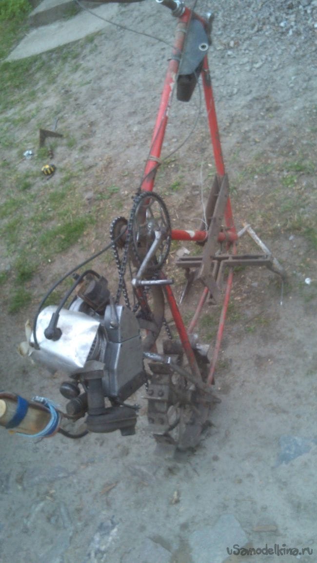 Основание (рама) выполнена из старого велосипеда, двигатель Д-5 или Д-6, в качестве редукторов звездочки от велосипедов, передаточный механизм стандартная велосипедная цепь. На раму смонтировано ведущее колесо (грунтозацеп). Рабочие органы лапы стрелы для прополки, или лапа для нарезки борозд под посадку картофеля. Можно также копать картофель. На двигатель сделан кожух ил листового алюминия и смонтирован пластиковый вентилятор для охлаждения двигателя. Автор творения Петр