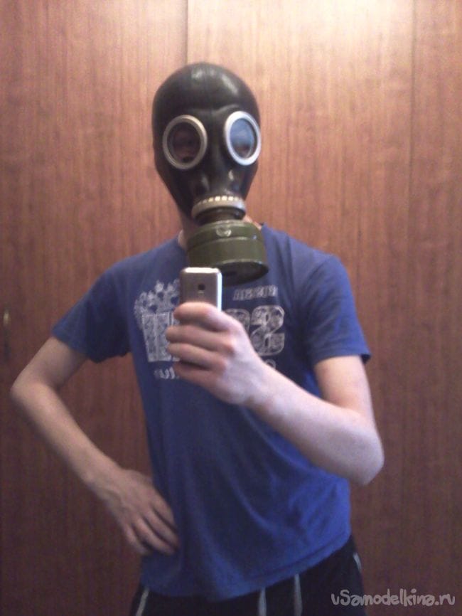 В прошлый День Победы к противогазу фонарик примотал... Дело вечером было, и пошёл смотреть салют... Люди оборачивались на свет фонарика, и... Самой частой фразой было: "Тваюжмать!", или просто "№*%!" Некоторые со мной фотографировались... (Потом месяц в нём в троллейбусе ездил... И тогда меня уже водители автобусов фоткали) Сейчас хочу усилить эффект