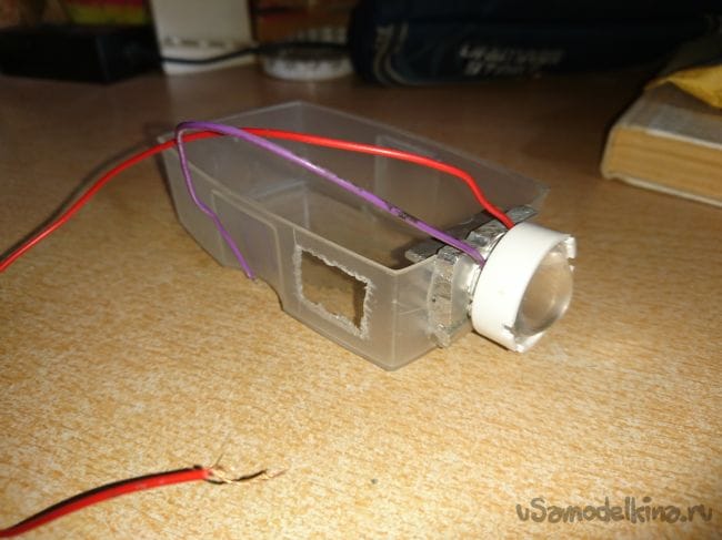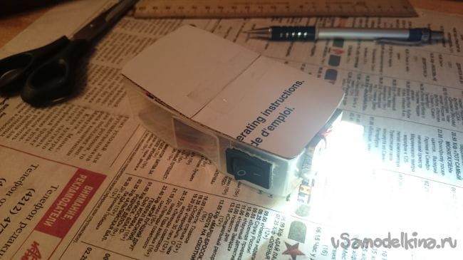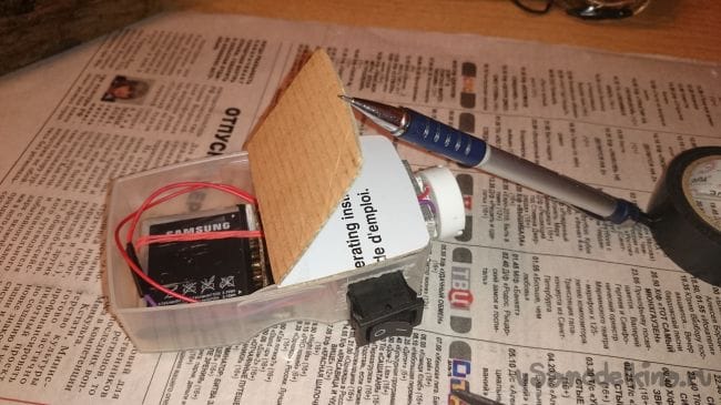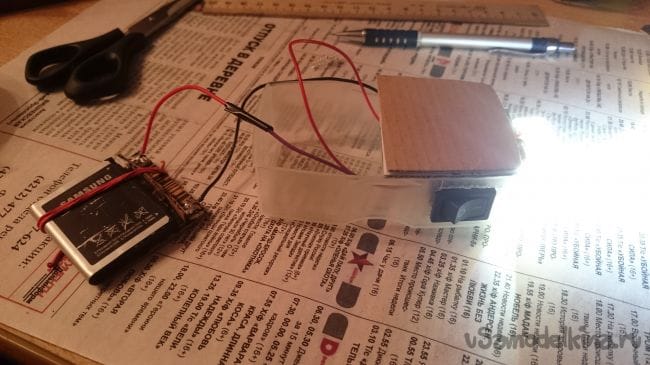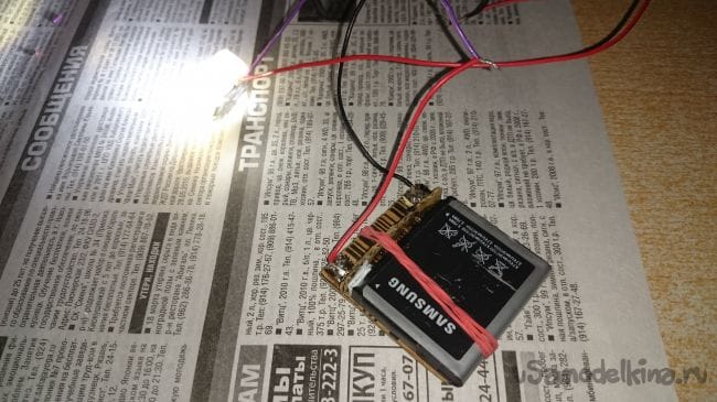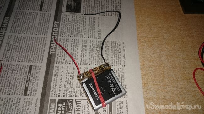 Сначала изготовил держатель (контакты) под аккумулятор. Для этого вырезал небольшое картонное основание(из плотного картона). Далее вырезал по ширине основания торец, из того же картона, в него вставлены провода (от витой пары. Удобно что они как проволока-жесткие.) Слева от контактов приклеена бумага в виде гармошки (подпружинивает аккумулятор, т.к с другой стороны контакты). По краям основания приклеены контактные пластины-кусочки от фольгированного стеклотекстолита. На них припаяны провода. Край аккумулятора чуть выступает за основание. Когда надевается резинка, она прижимает аккумулятор к контактам.