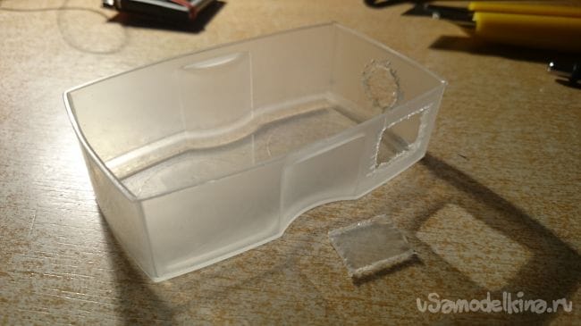 Крышку сделал из плотного картона. Вырезал по форме. Т.к. этот аккумулятор я использую еще кое-где, поэтому выводить разъем под зарядку аккумулятора не стал, поэтому необходим был доступ к нему. Изначально хотел сделать сдвижную часть в крышке, не стал заморачиваться-сделал откидывающуюся: разрезал пополам, наклеил скотч. Та часть, которая над радиатором приклеена. Другая сторона откидывается. Чтобы не открылась, приклеена скотчем к корпусу. Также такая конструкция крышки позволяет приклеить к ней поролон, чтобы когда крышка закрыта, аккумулятор не болтался в корпусе. Поролона под рукой не оказалось, я не стал делать, может потом приклею.