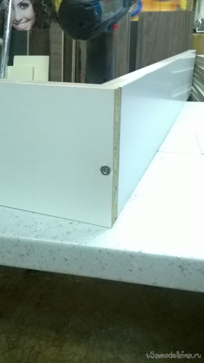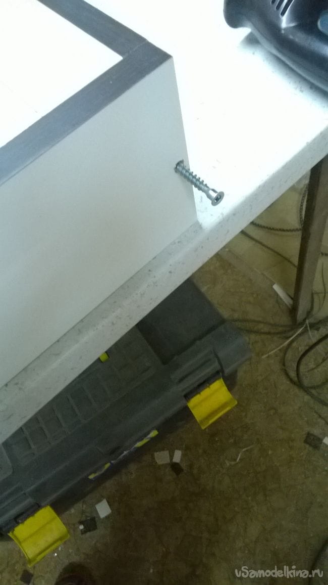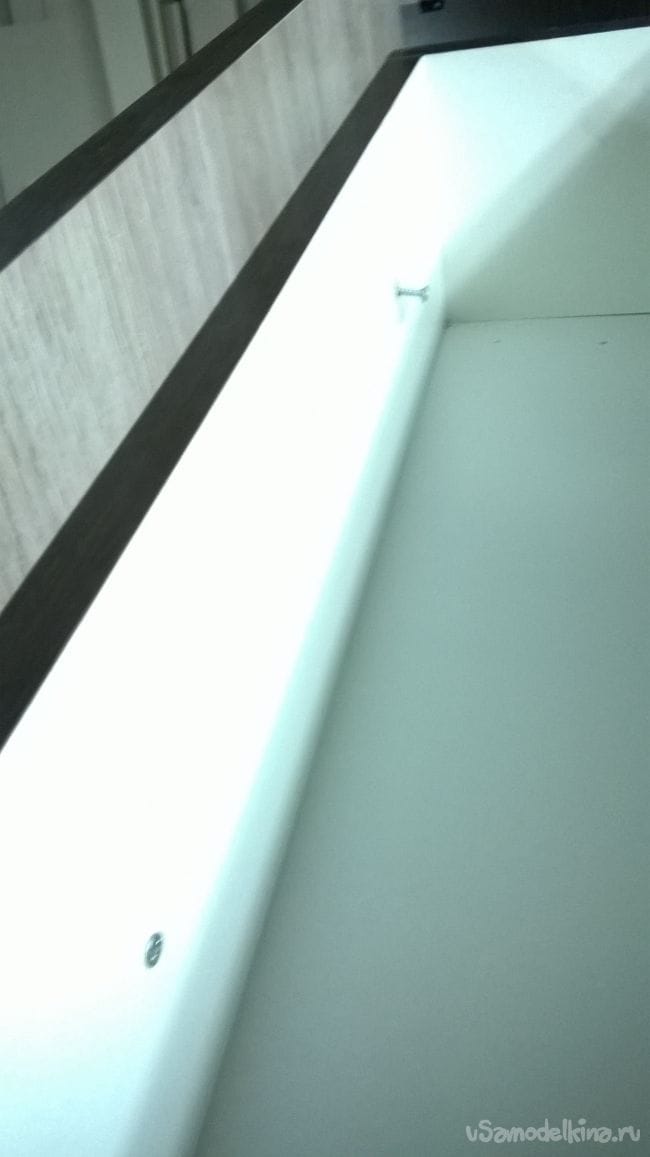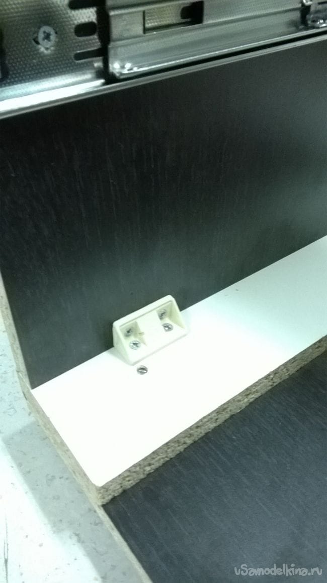 Прислоняем обратно фасад, совмещаем отверстие с саморезом. Закручиваем саморез. Закрываем ящик и снова выставляем фасад, убедившись что все ровно, закручиваем еще по одному саморезу с каждой стороны.