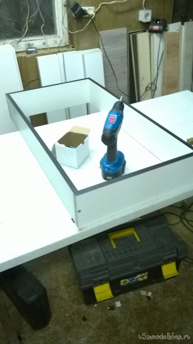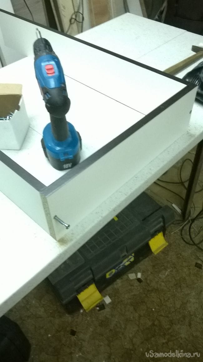 Переворачиваем комод лицом вниз и пробиваем заднюю стенку. Незабываем про диагональ.