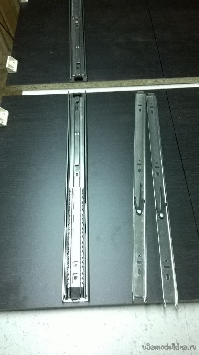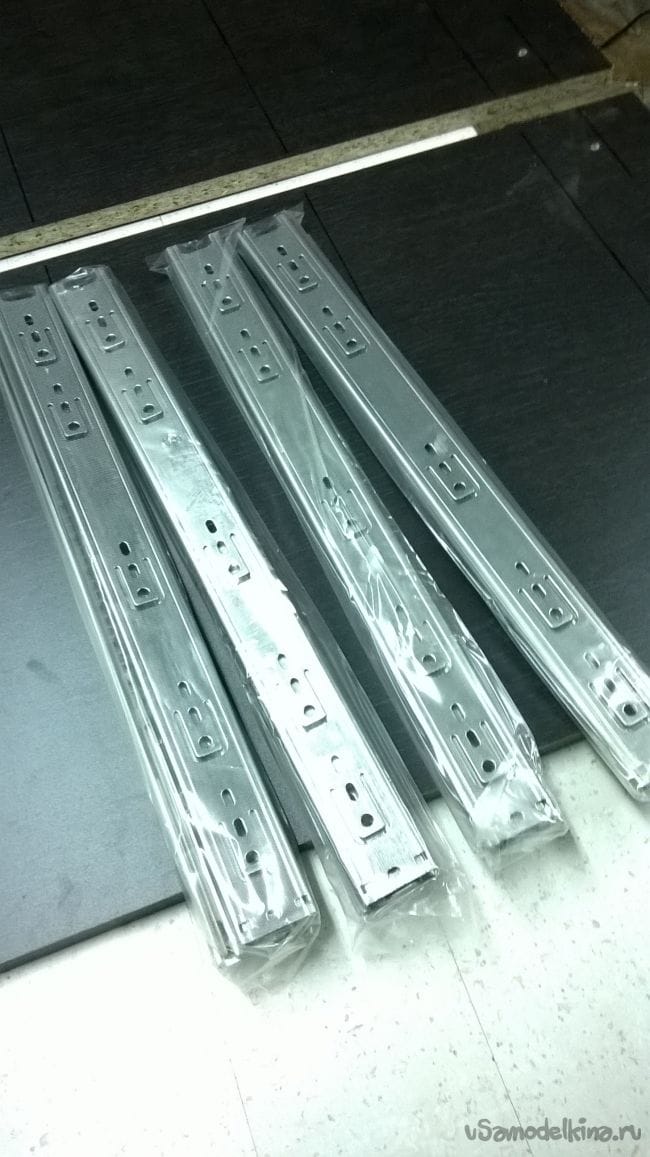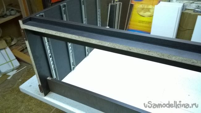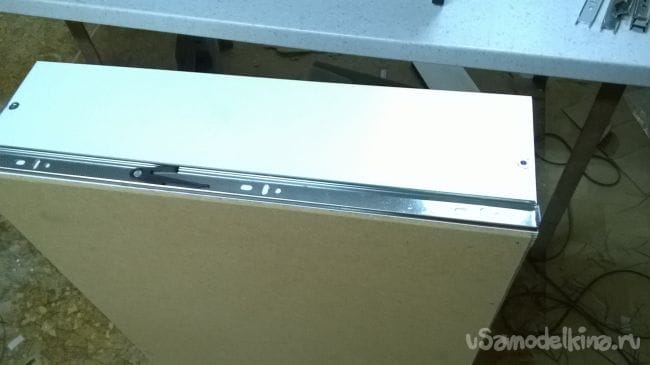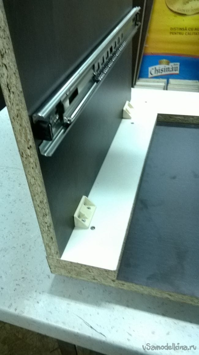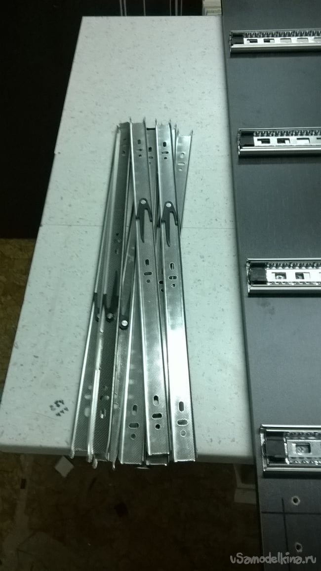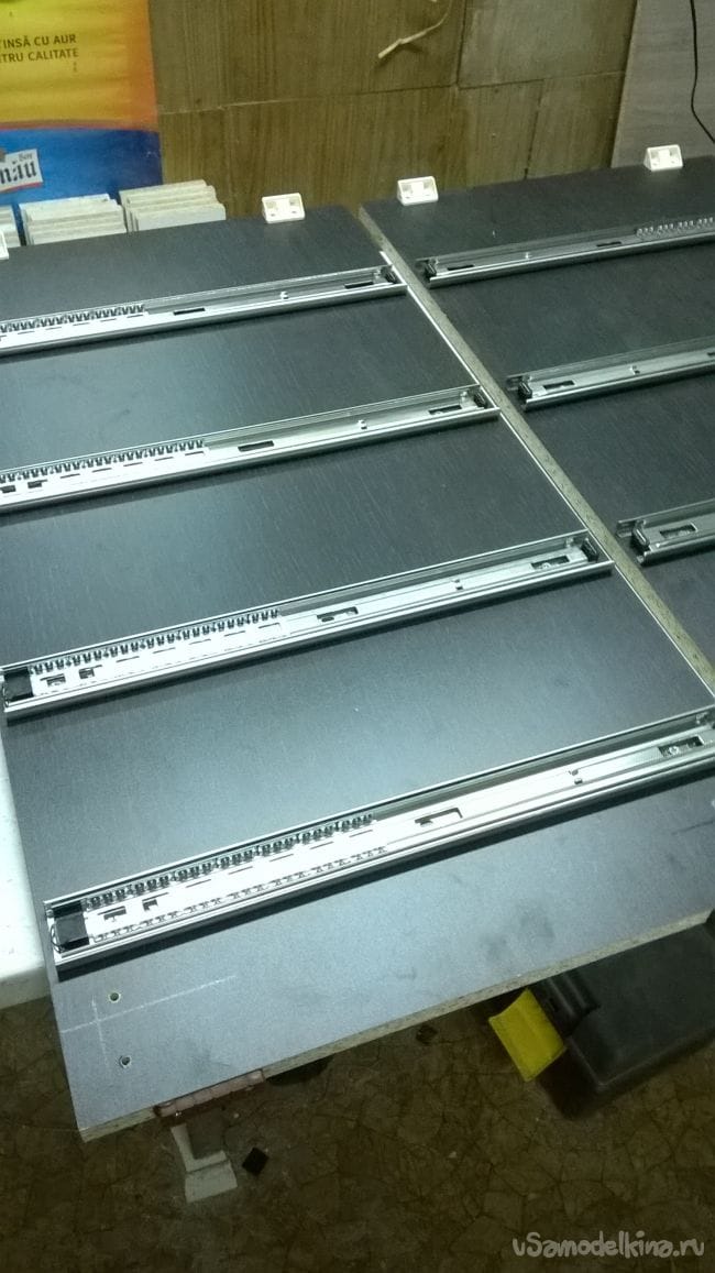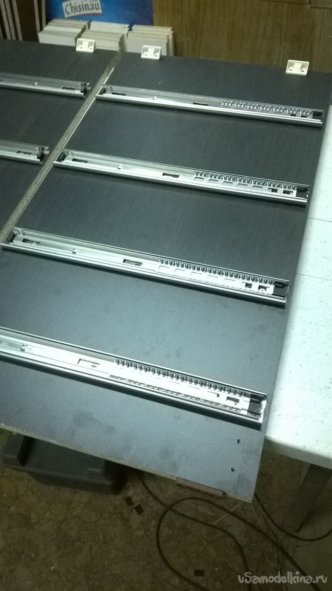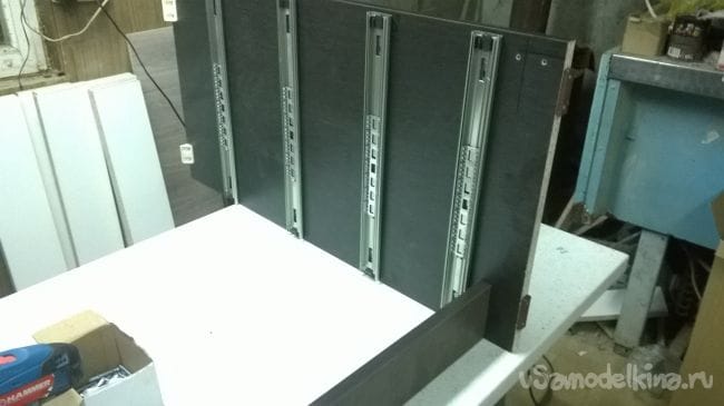 Пришло время ящиков. Возьмем планки от направляющих и закрепляем их на ящики.