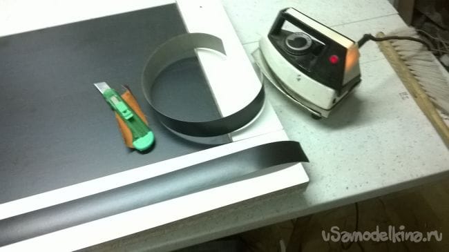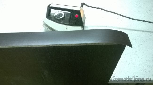 И так начнем. Для начала при помощи утюга проклеиваем кромку, кромка клеится на все детали с одной стороны продольно. Проходя утюгом сзади слегка затираем тряпочкой,для лучшей сцепки клея. Потом аккуратно срезаем излишки кромки канцелярским ножом. Фасады мы обклеиваем с четырех сторон, по кругу.