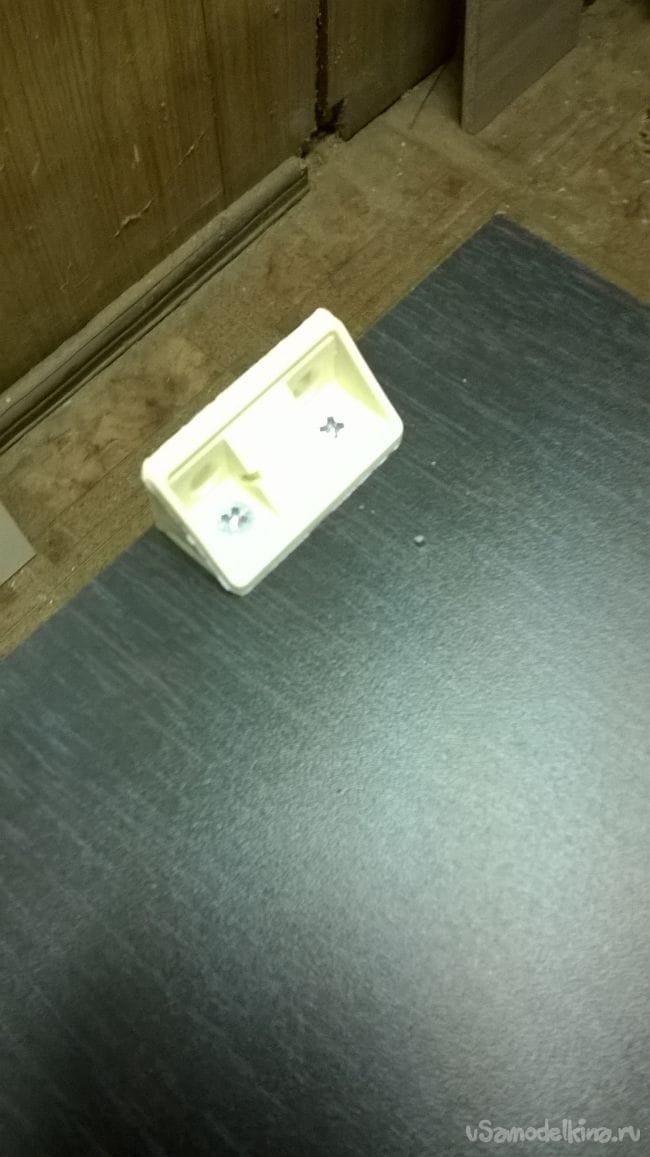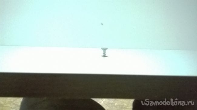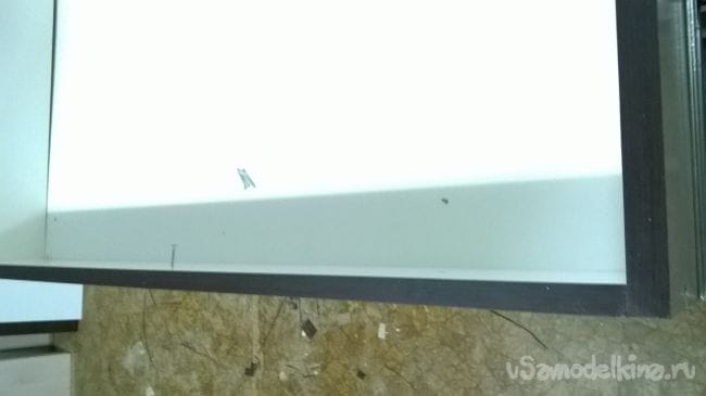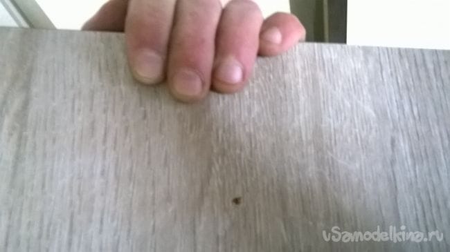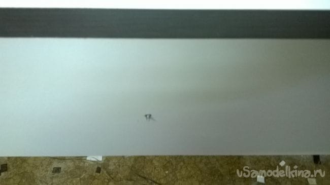 В среднее отверстие изнутри вкручиваем саморез на 30 мм,так чтоб он выходил на 4-5 мм. Приставляем фасад к комоду , примерно выставляем его по высоте и по бокам. Как только вы убедились в правильном расположении, слегка ударьте по фасаду. С другой стороны фасада появится маленькая точка от шурупа. Ее надо слегка расширить шилом.