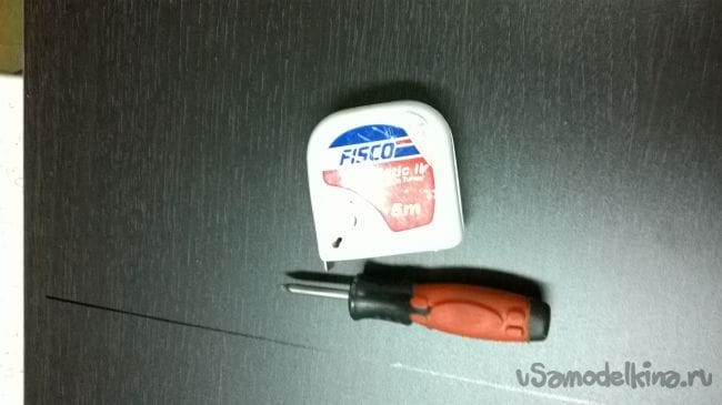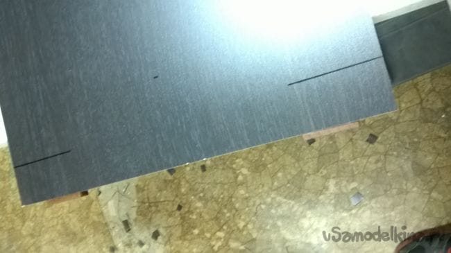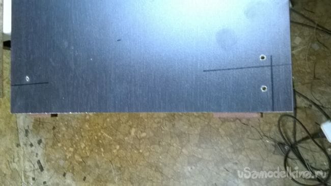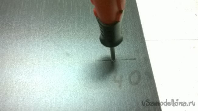Теперь при помощи шила и рулетки, отметим наши отметки. От края (со стороны кромки) отмеряем 40 мм и шилом делаем прокол, метка для крепления направляющей.