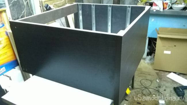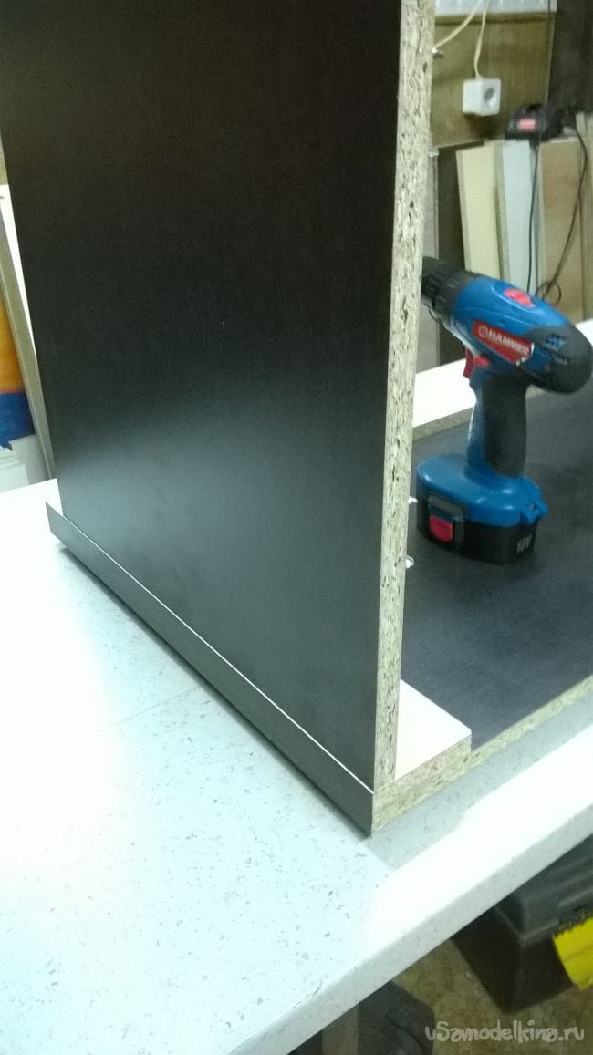 Размечаем маркером положение нижних перемычек, для этого возьмем наш цоколь и приложем его по плоскости снизу боковины и прочерчиваем.
