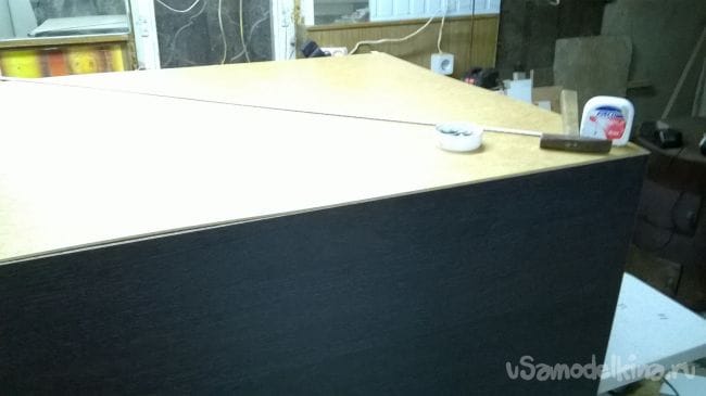 Займемся боковинами комода. Для начала разложим их зеркально, лицевой стороной вниз, а кромкой наружу.