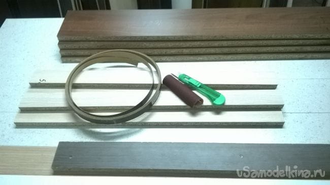 И так проклеиваем кромку. Все детали обклеиваются со всех четырех сторон, по кругу.