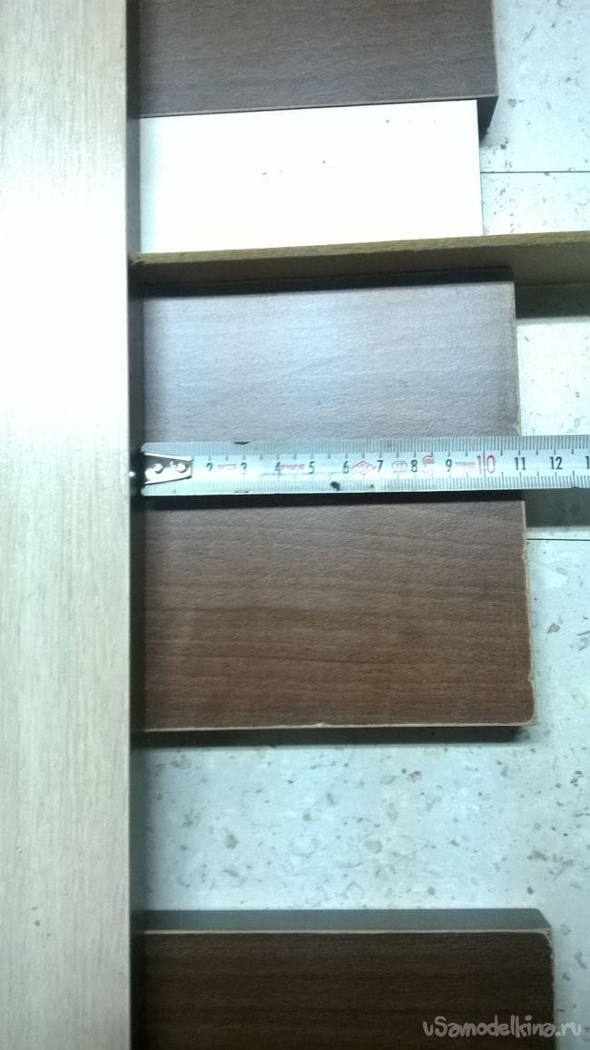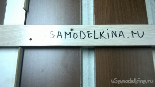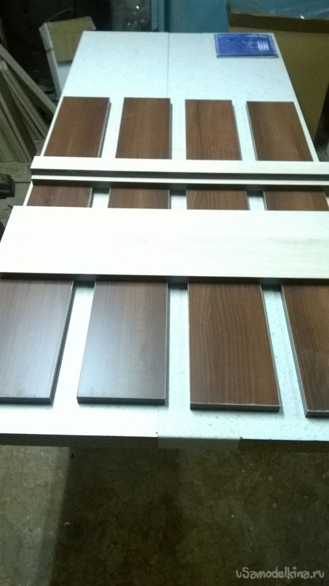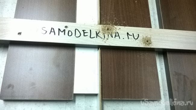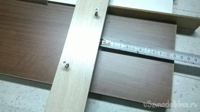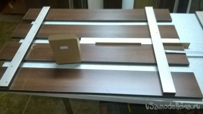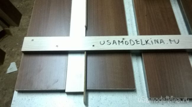 Пропустив 54 мм. ставим следующею планку, (у меня была полоса ламината шириной 50 мм я просто добавил еще полосочку ДВП, как раз получилось 54 мм.