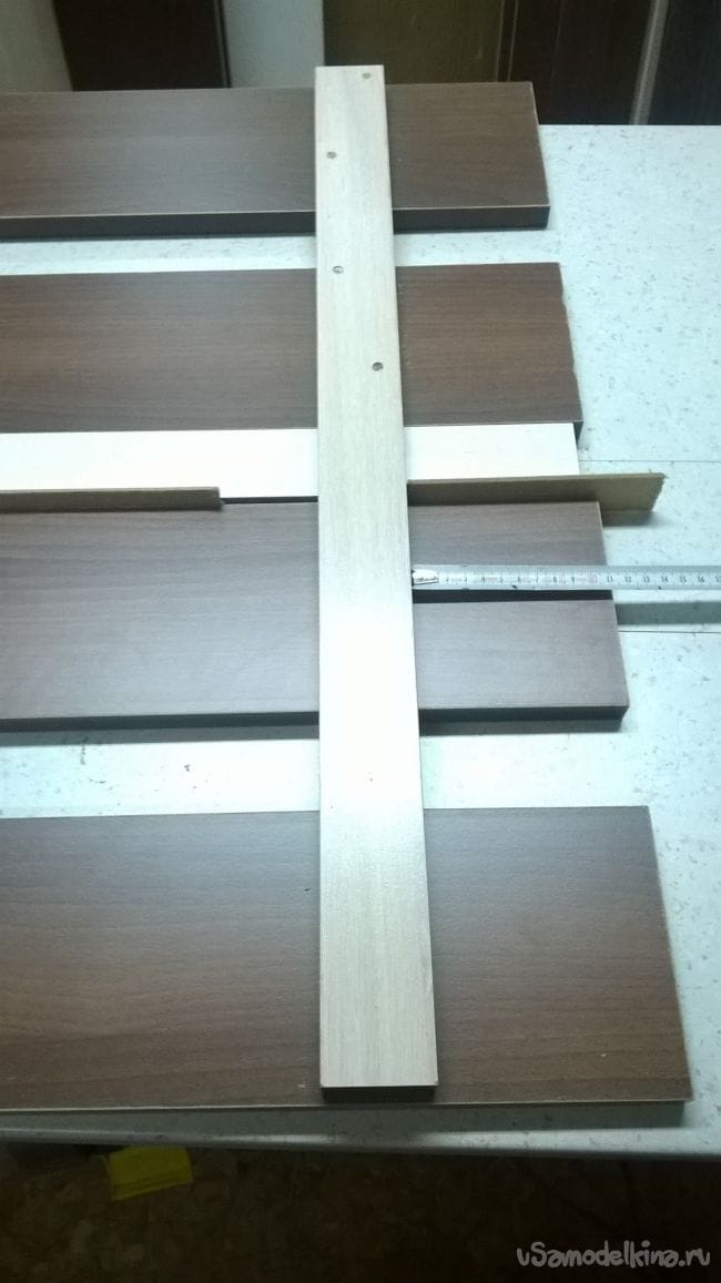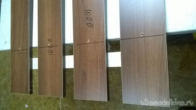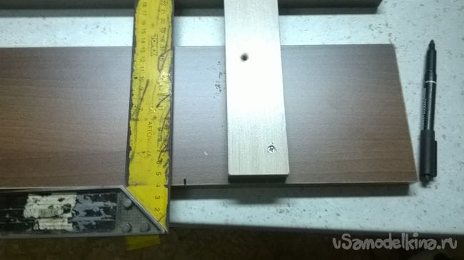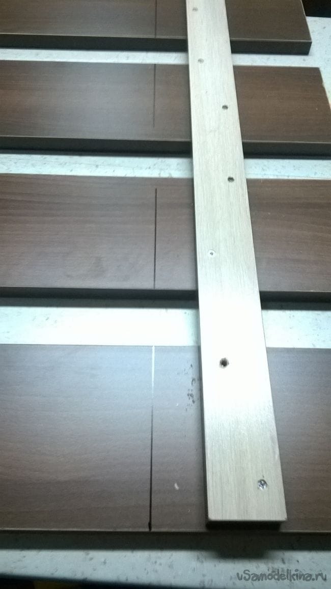 Выставляем полку по линии с лицевой стороны, и сверлим отверстия через обе планки.