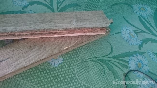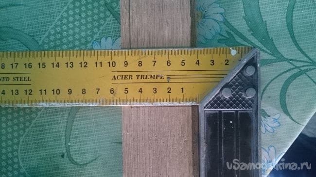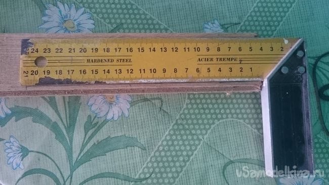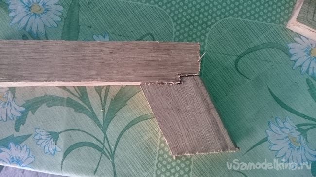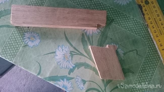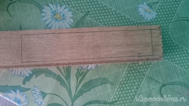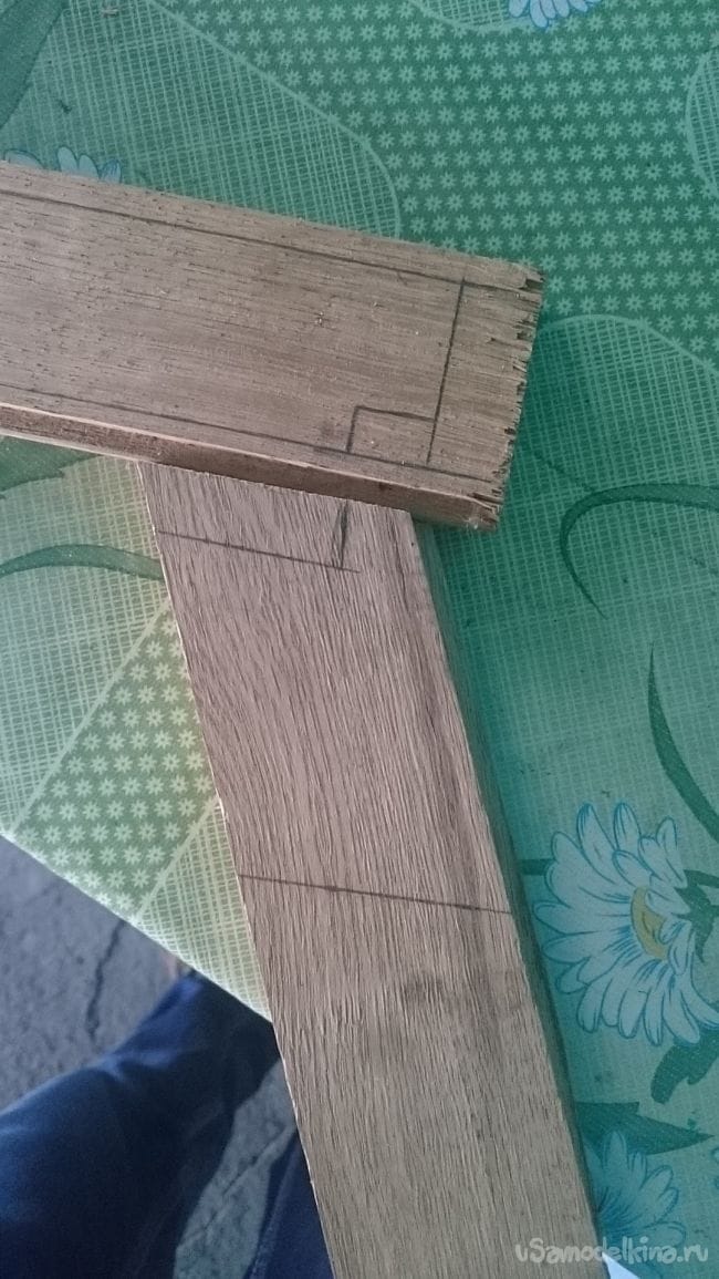 Расположив перед собой две паркетины или же дощечки, намечаем эскиз будущего изделия, ровные линии делаем при помощи строительного карандаша и уголка. Для большей крепости ручки я решил выпилить маленький уголок на основной части и оставить зацепление на ручке, чтобы было как одно целое.