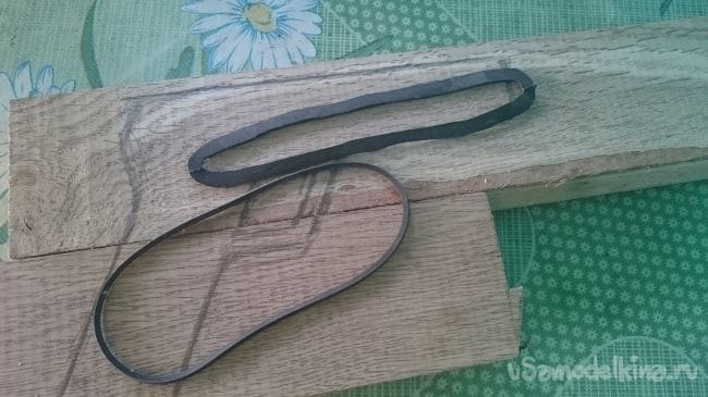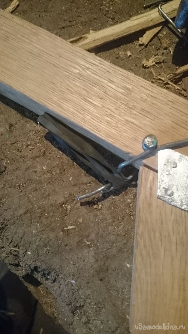 Спусковой механизм готов, но шпонка, которая будет зажиматься на стволе может произвольно вылететь, поэтому при помощи молотка, гвоздей и камеры от колеса ставим ее маленький кусочек под изгиб спицы.