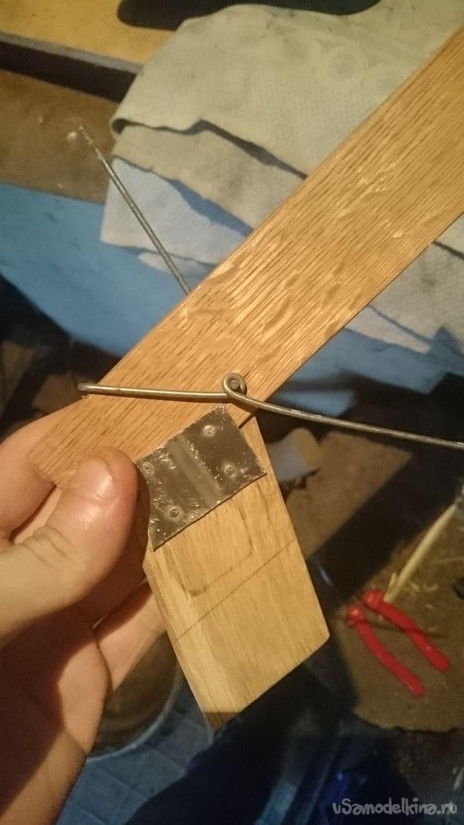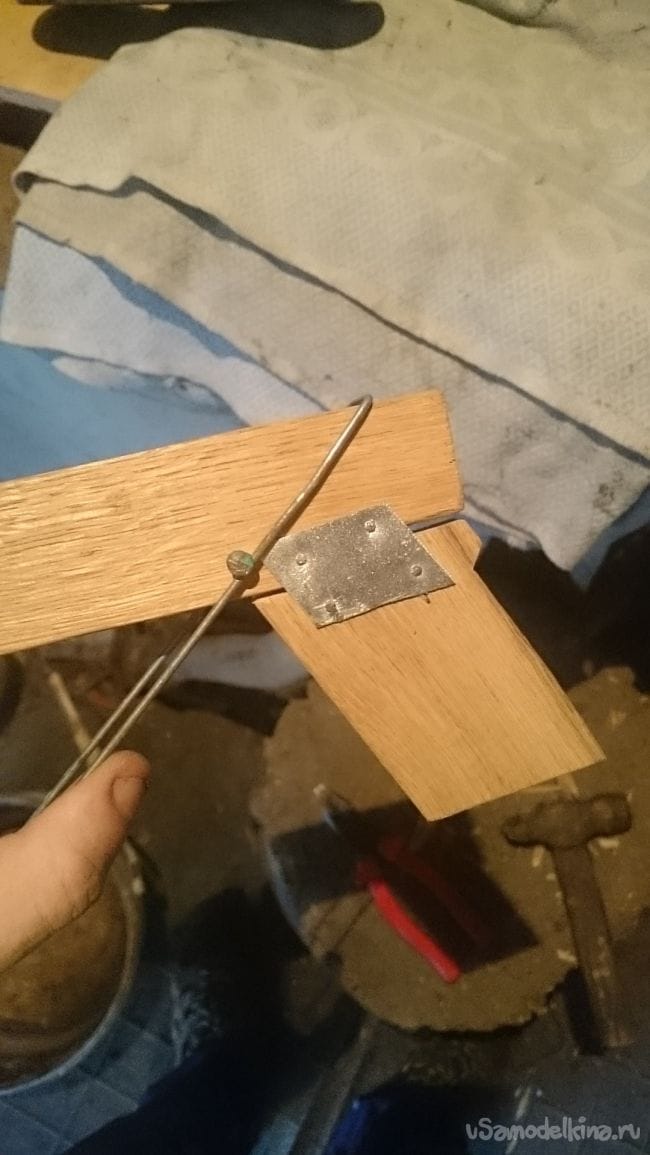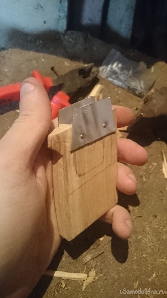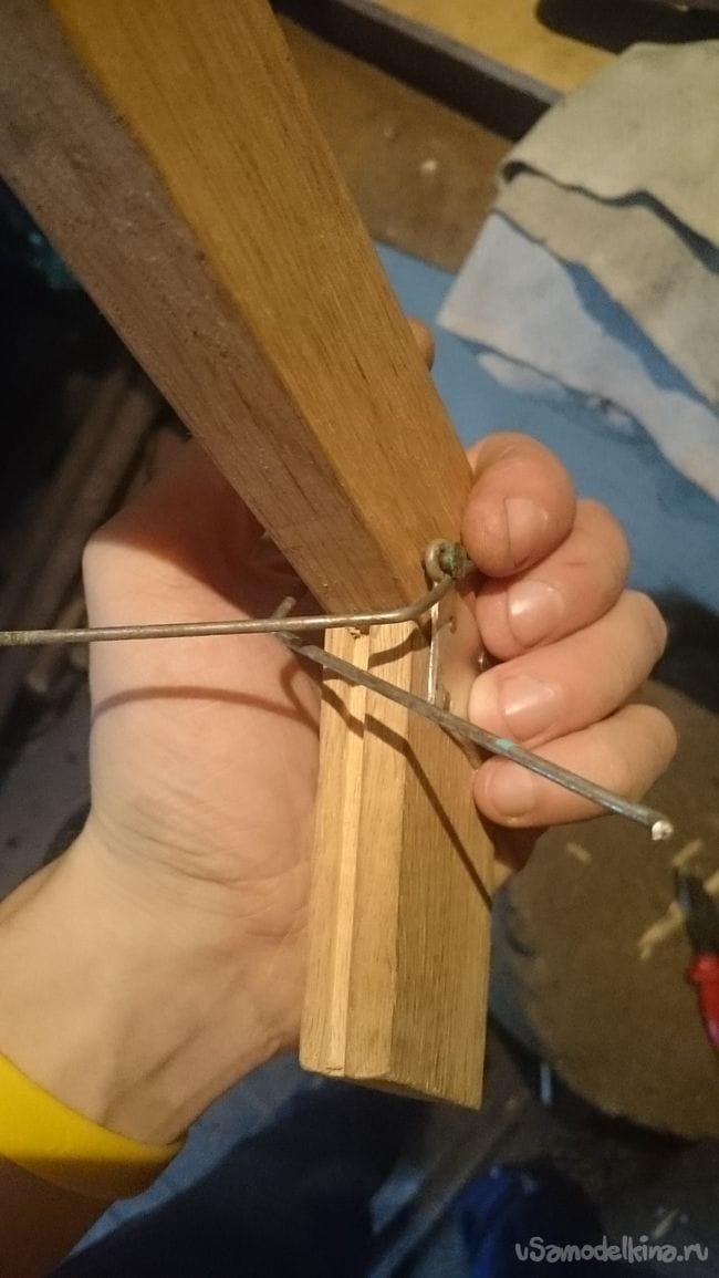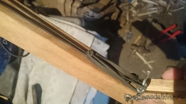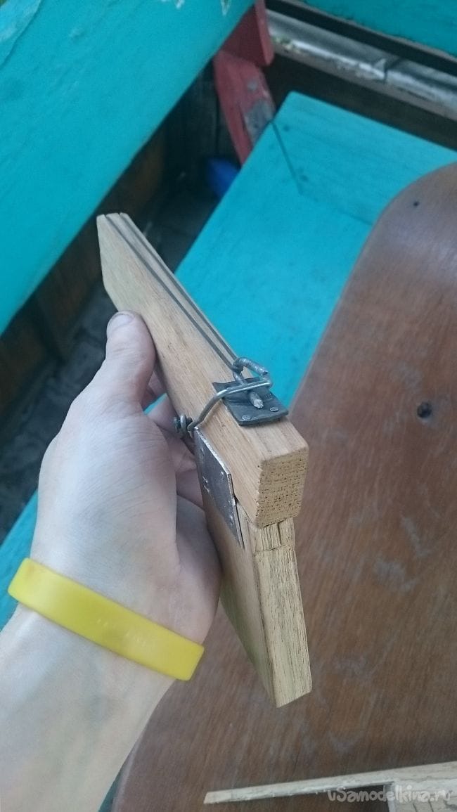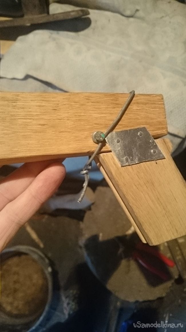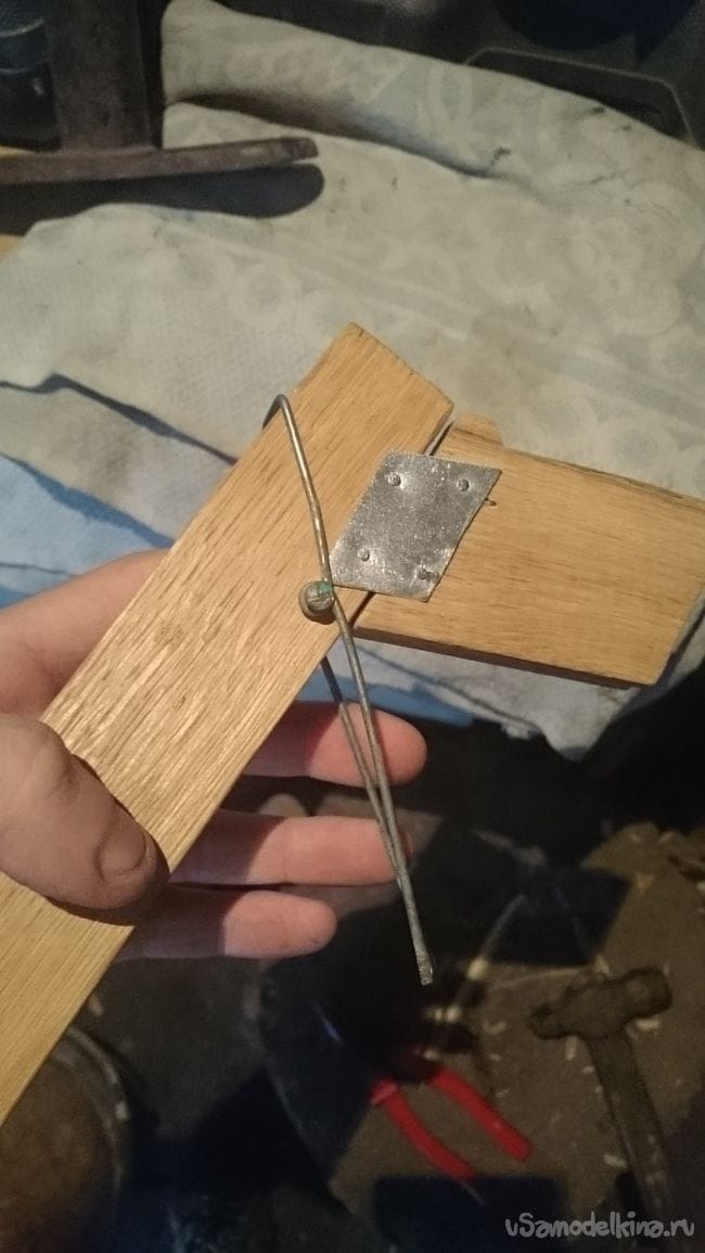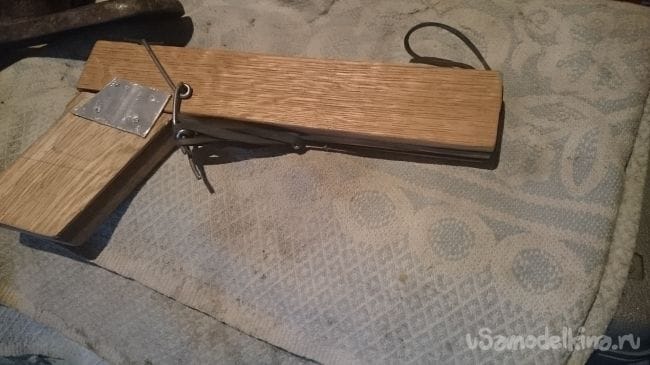 Под низом прибиваем гвоздик соблюдая небольшой угол, там будет крепиться резинка для курка, в три оборота затягиваем ее на гвоздик, если нет резинки можно установить пружину.