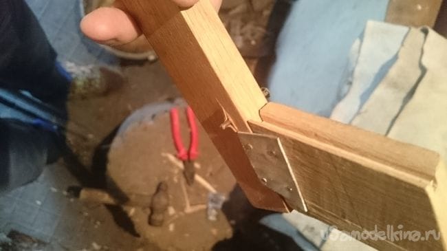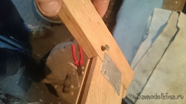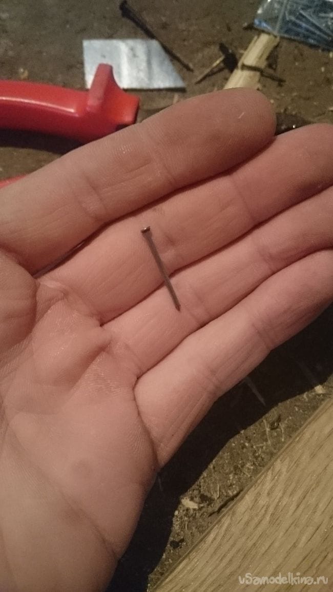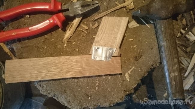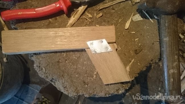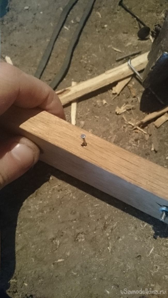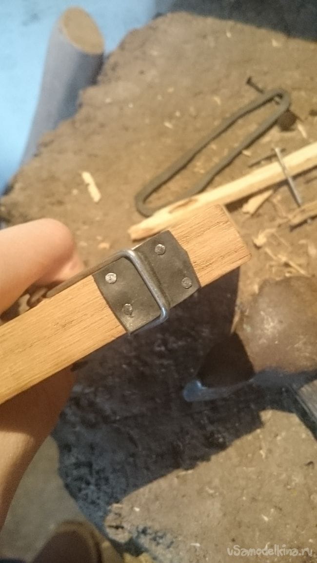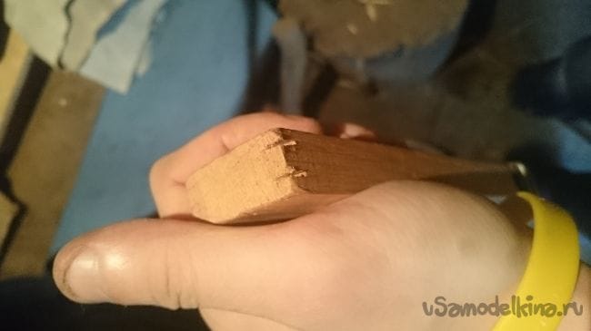Чтобы закрепить их на нашем изделии, возьмем пару гвоздиков на каждую сторону и при помощи молотка прибьем к ручке, а затем к основанию ствола. Такая конструкция держится довольно крепко и не требует клея.