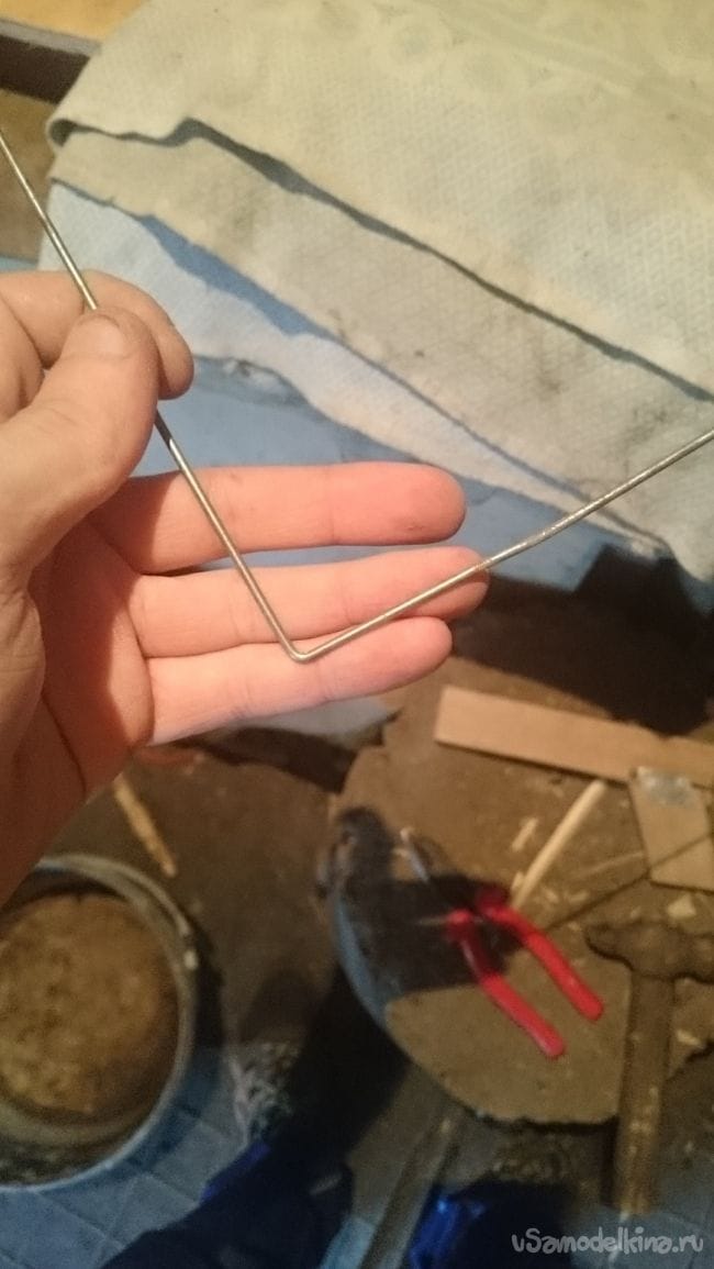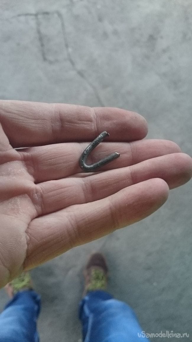 После этого снимаем с колеса спицу, загибаем ее примерно посередине плоскогубцами под 90 градусов, отмерив толщину пистолета загибаем второй край, но не беребарщиваем, чтобы получилось так.