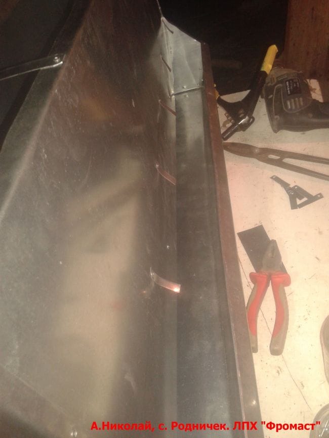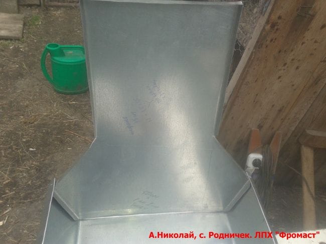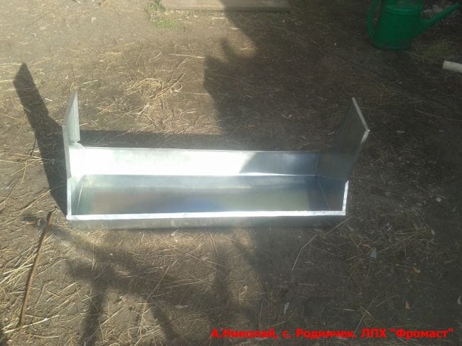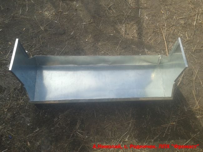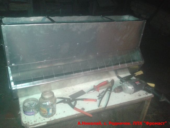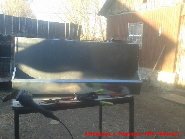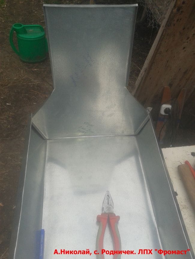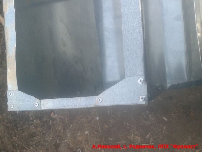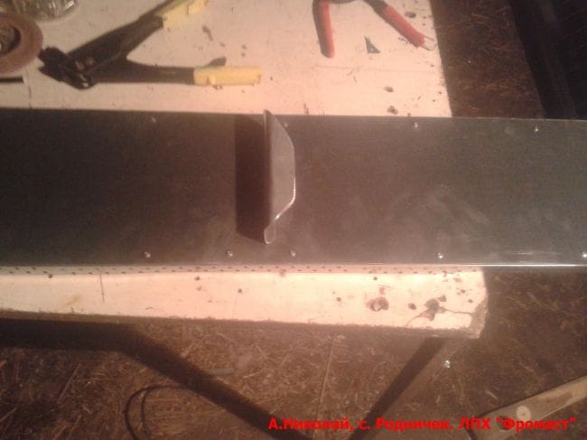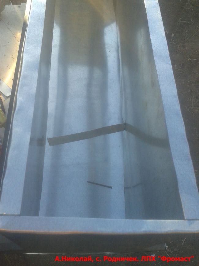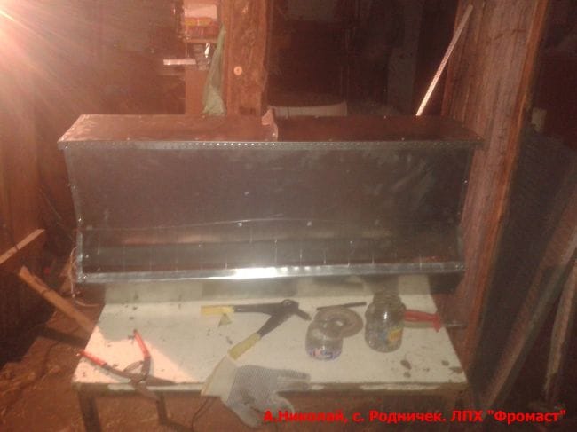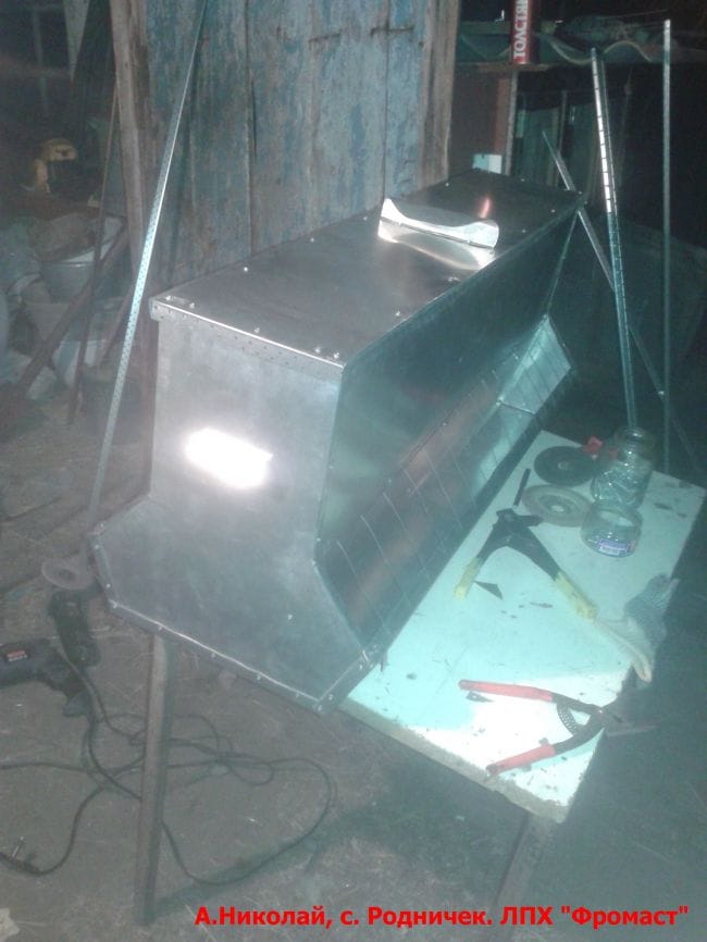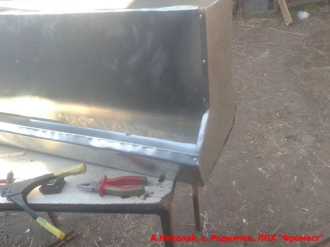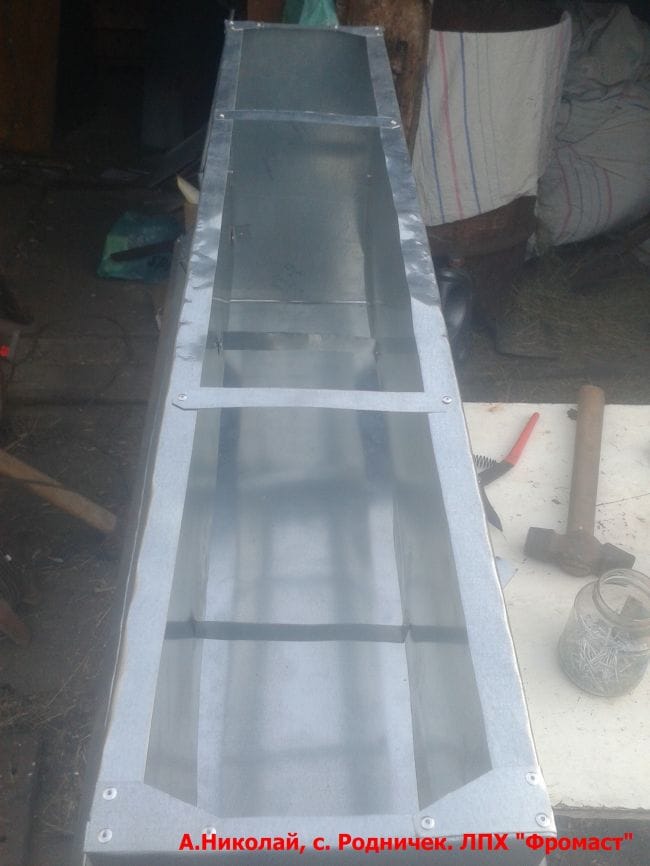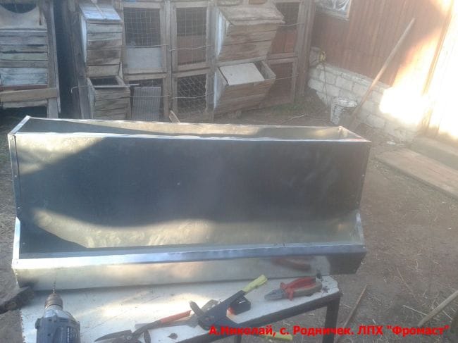 Основная работа сделана. Так как кормушка у меня достаточно большая, в нее будет входить по моим прикидкам мешка полтора корма, то нужно укрепить ее бункерные стенки. Это нужно чтобы зерно в ней не распирало стенки, что приведет к деформации всей конструкции. Для этого я вырезал полосы из той же оцинковки и согнул их по краям под углом 90 градусов, в виде буквы П. Их я приклепал во внутреннее пространство бункера.