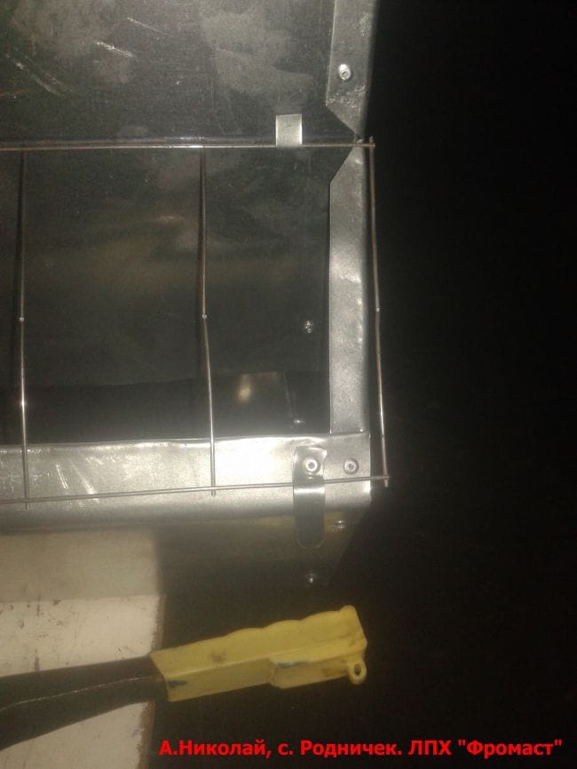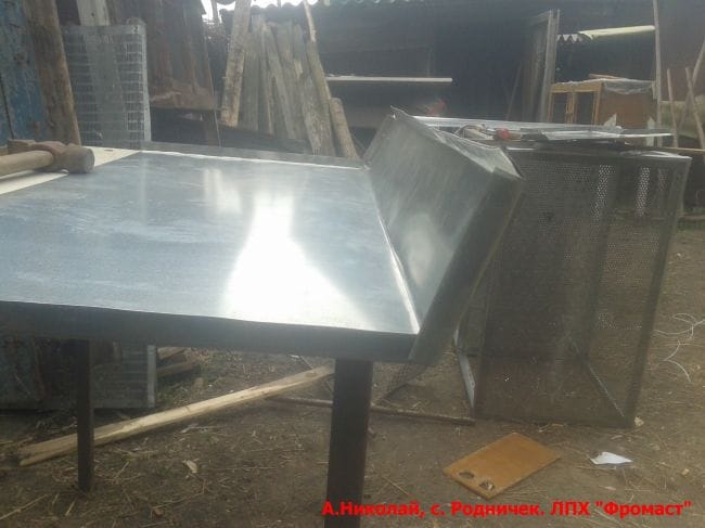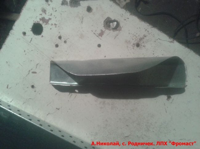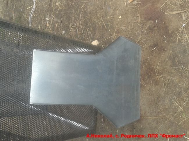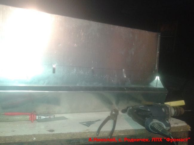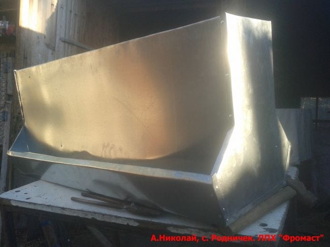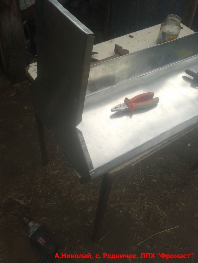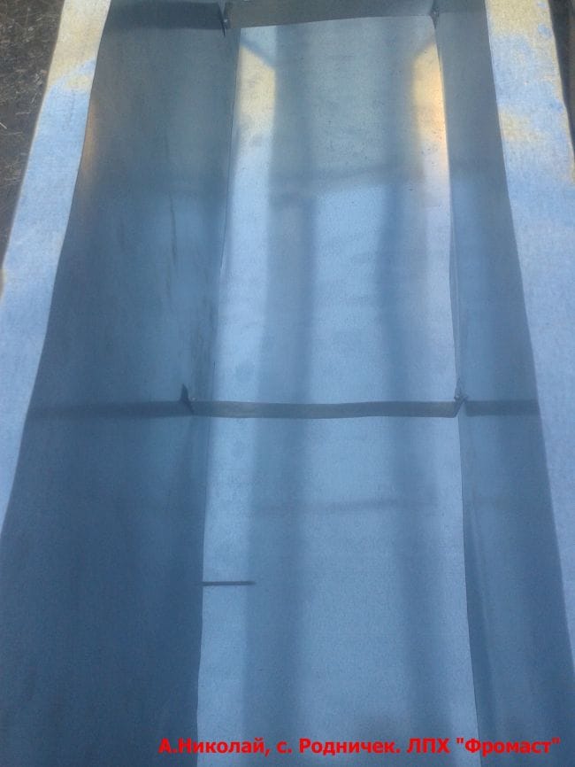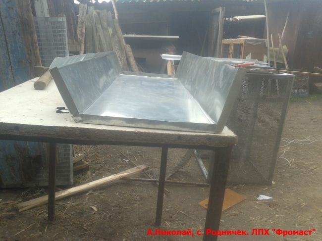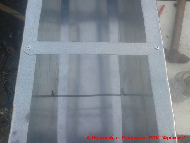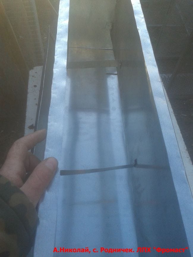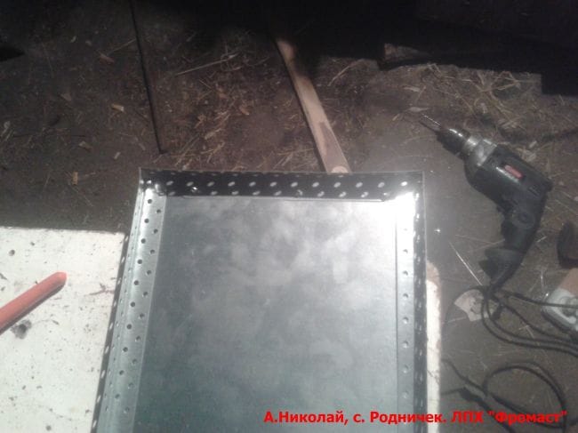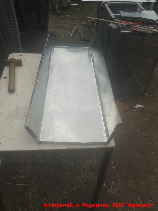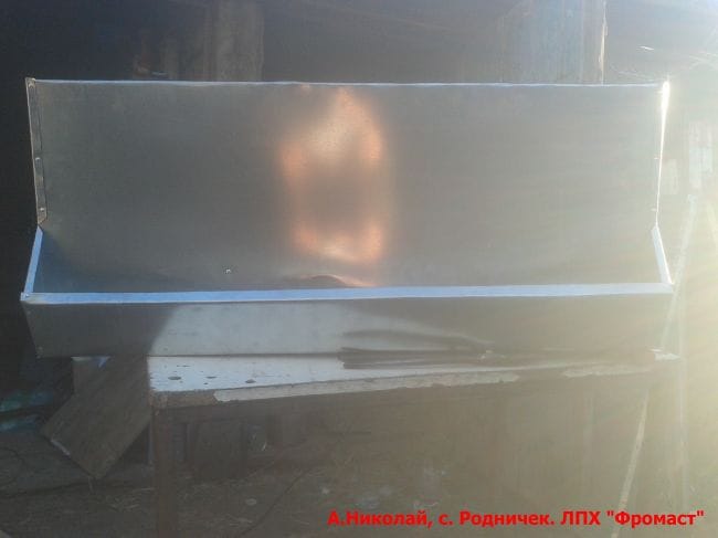 Основная работа сделана. Так как кормушка у меня достаточно большая, в нее будет входить по моим прикидкам мешка полтора корма, то нужно укрепить ее бункерные стенки. Это нужно чтобы зерно в ней не распирало стенки, что приведет к деформации всей конструкции. Для этого я вырезал полосы из той же оцинковки и согнул их по краям под углом 90 градусов, в виде буквы П. Их я приклепал во внутреннее пространство бункера.