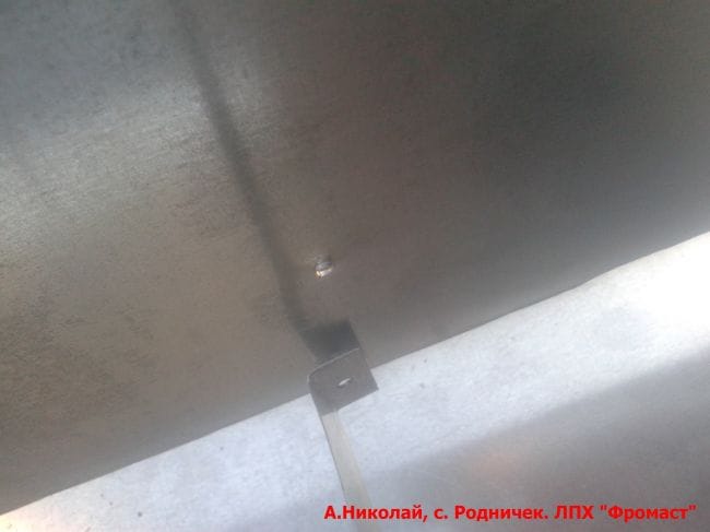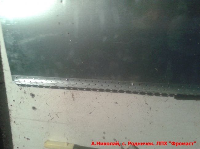 Пришла пора крепить сетку. Для этого я нарезал небольшие полоски оцинковки, которые предварительно просверлил в одном конце. Разметив на кормушке место размещения сетки, проделал отверстия и приклепал туда эти заготовочки. Они играют роль петель при поднятии сетки. Можно закрепить и жестко, чтобы сетка не могла подниматься, но тогда, в случае загрязнения кормушки ее будет очень неудобно чистить.