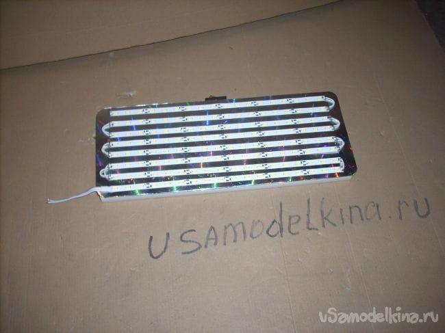 Против ожиданий получилось неплохо. На полученную основу наклеил предварительно нарезанную на соответствующие куски (которые, конечно, сначала спаял между собой и проверил, светят ли они) светодиодную ленту. Вот что вышло в итоге: