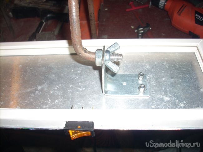 Крепление «светящейся» части лампы к каркасу сделал при помощи уголка, одной обычной гайки, одной гайки с барашком и двух маленьких болтиков с гайками: