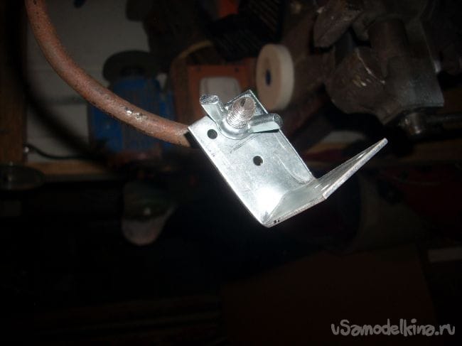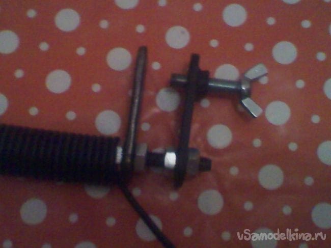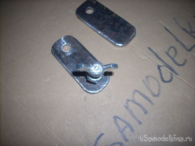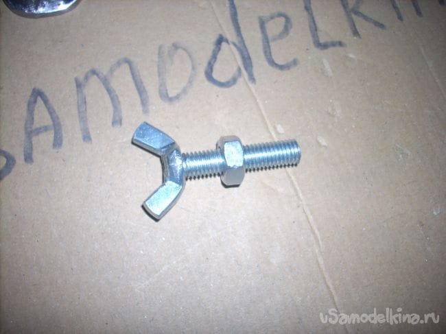 К куску с одним отверстием соосно с отверстием приварил гайку, в которую будет вкручиваться зажимной болт с барашком: