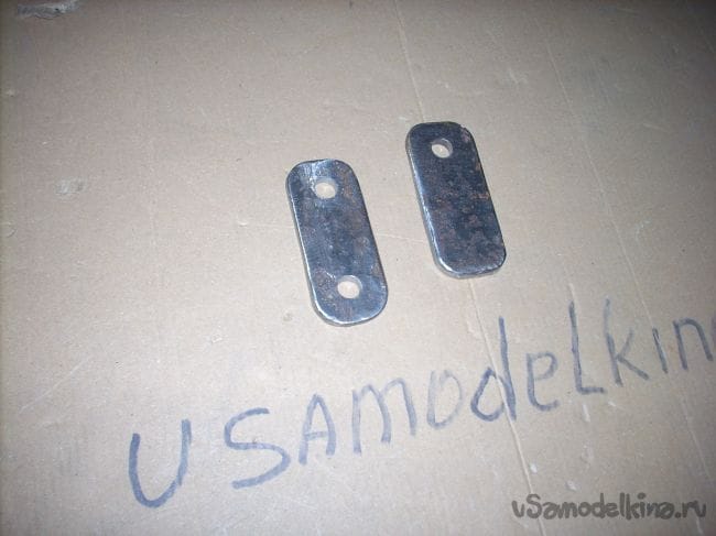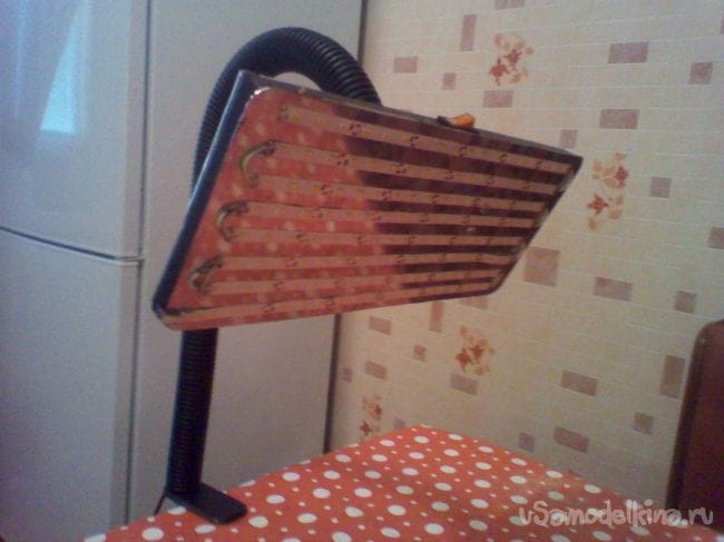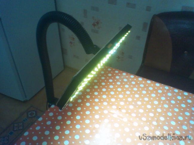 Крепление-зажим лампы к столу сделал из двух кусочков стальной полосы, в которых просверлил необходимые отверстия.