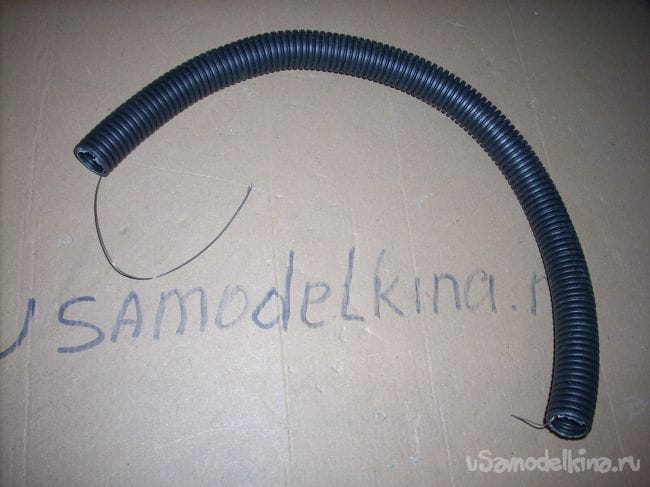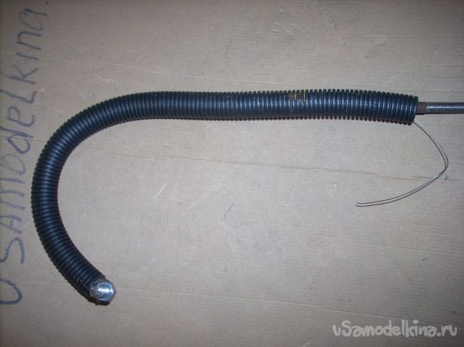 Крепление в сборе выглядит так (понадобилось еще несколько обычных гаек):Затем все детали покрасил чёрной краской. Для красоты на каркас надел кусок гофры для электропроводки.Внутри гофры протащил провод, которым подключил светящуюся часть лампы (через жёлтую кнопочку) к блоку питания.