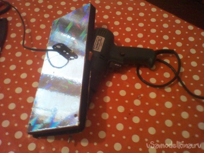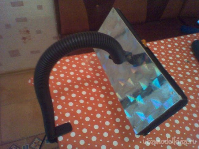 Я решил сделать «дизайнерскую» настольную лампу для работы в мастерской. Для начала я вырезал из старого промышленного холодильника, валявшегося на работе на свалке, кусок алюминиевого листа, на который намеревался наклеить имевшуюся ленту. Первоначально предполагалось, что алюминий я отполирую до зеркального состояния, но в процессе работы выяснилось, что добиться приемлемого качества полировки не удастся. Поэтому придав листу необходимую форму, я оклеил его блестящей самоклеющейся бумагой-фольгой.